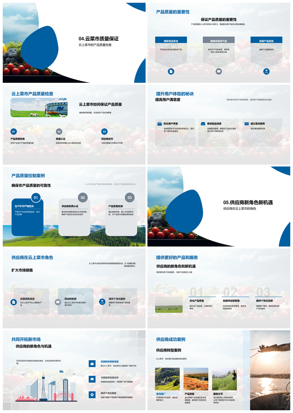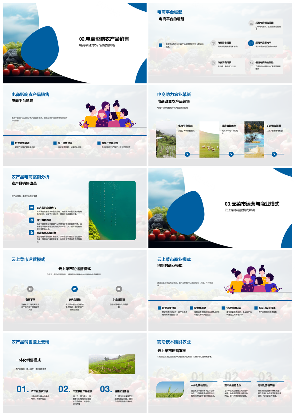 这是一张农产品电商云上菜市革新生鲜销售新生态PPT模板,包含农产品、电商、云上菜市、革新、生鲜销售、新生态等主题内容,也可用作农产品电商云上菜市革新、电商云上菜市革新生鲜销售、云上菜市革新生鲜销售新生态、农产品电商云上菜市、电商云上菜市革新、云上菜市革新生鲜销售、革新生鲜销售新生态、农产品电商革新、电商革新生鲜销售、生鲜销售新生态、农产品生鲜销售、电商新生态、云上菜市新生态、革新生鲜销售、生鲜销售新生态等PPT场景使用。 风云办公提供的农产品电商云上菜市革新生鲜销售新生态PPT模板,下载格式为pptx,一共28页,作品中文字及图均可以修改和编辑,图片更改请在作品中右键图片并更换,文字修改请直接点击文字进行修改。
