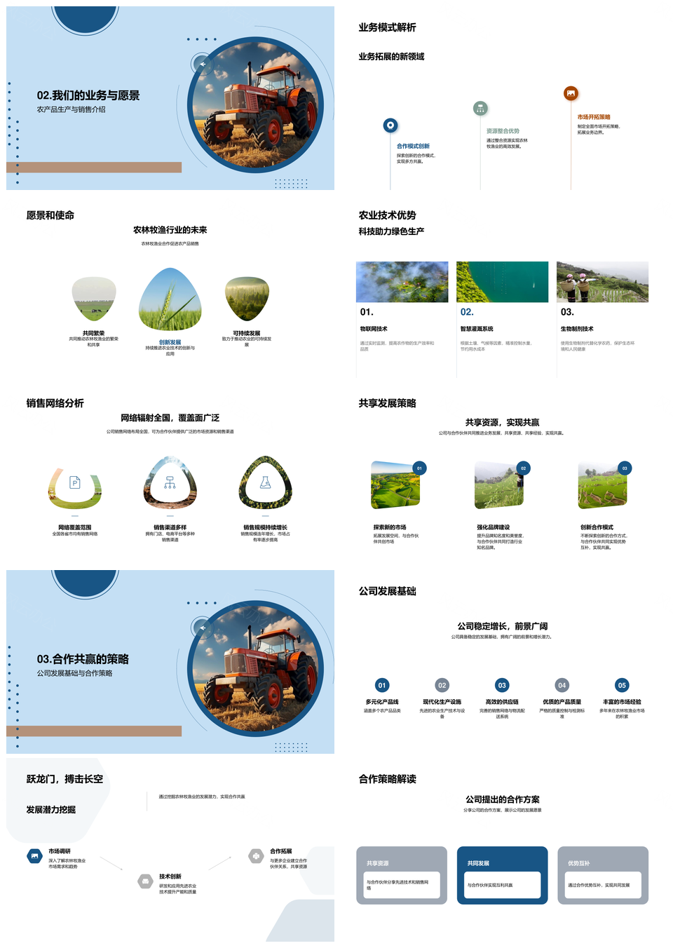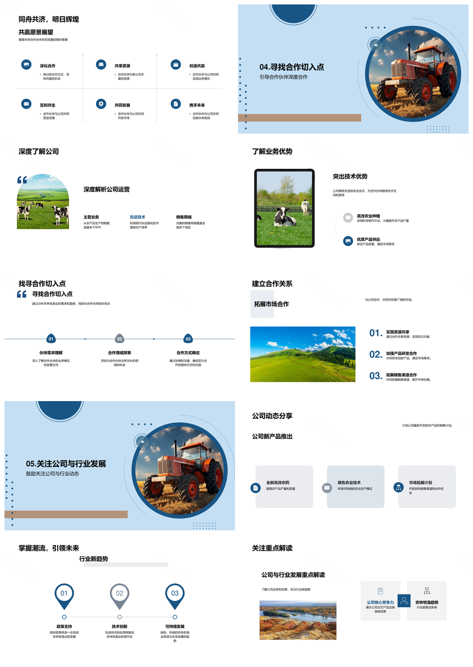 风云办公提供的农牧行业合作趋势下产品业务共赢发展PPT模板,下载格式为pptx,一共29页,作品中文字及图均可以修改和编辑,图片更改请在作品中右键图片并更换,文字修改请直接点击文字进行修改。