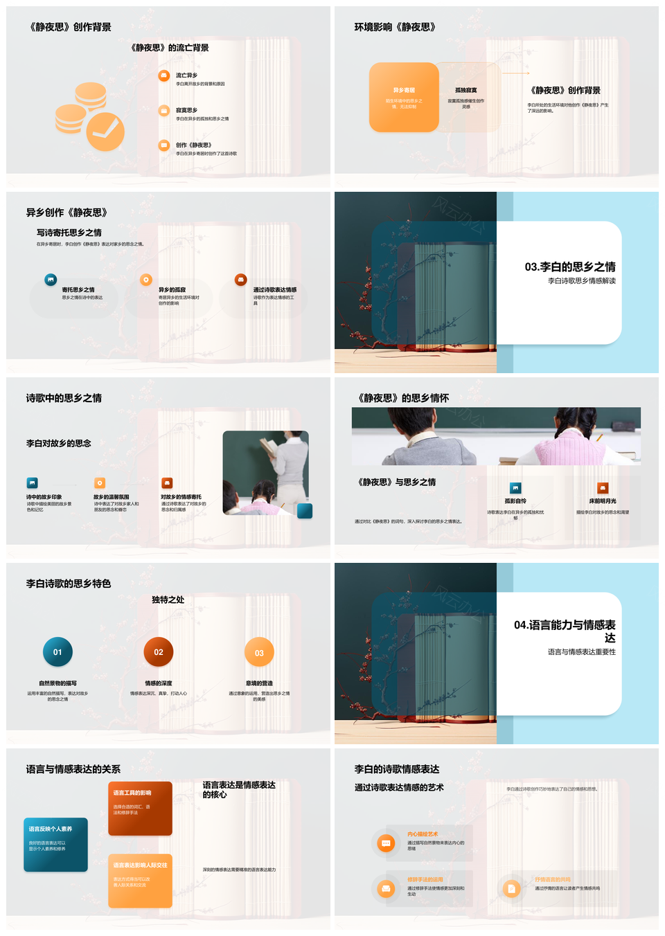 风云办公提供的李白静夜思情感表达与语文学习探析PPT模板,下载格式为pptx,一共23页,作品中文字及图均可以修改和编辑,图片更改请在作品中右键图片并更换,文字修改请直接点击文字进行修改。