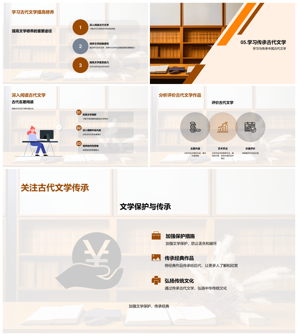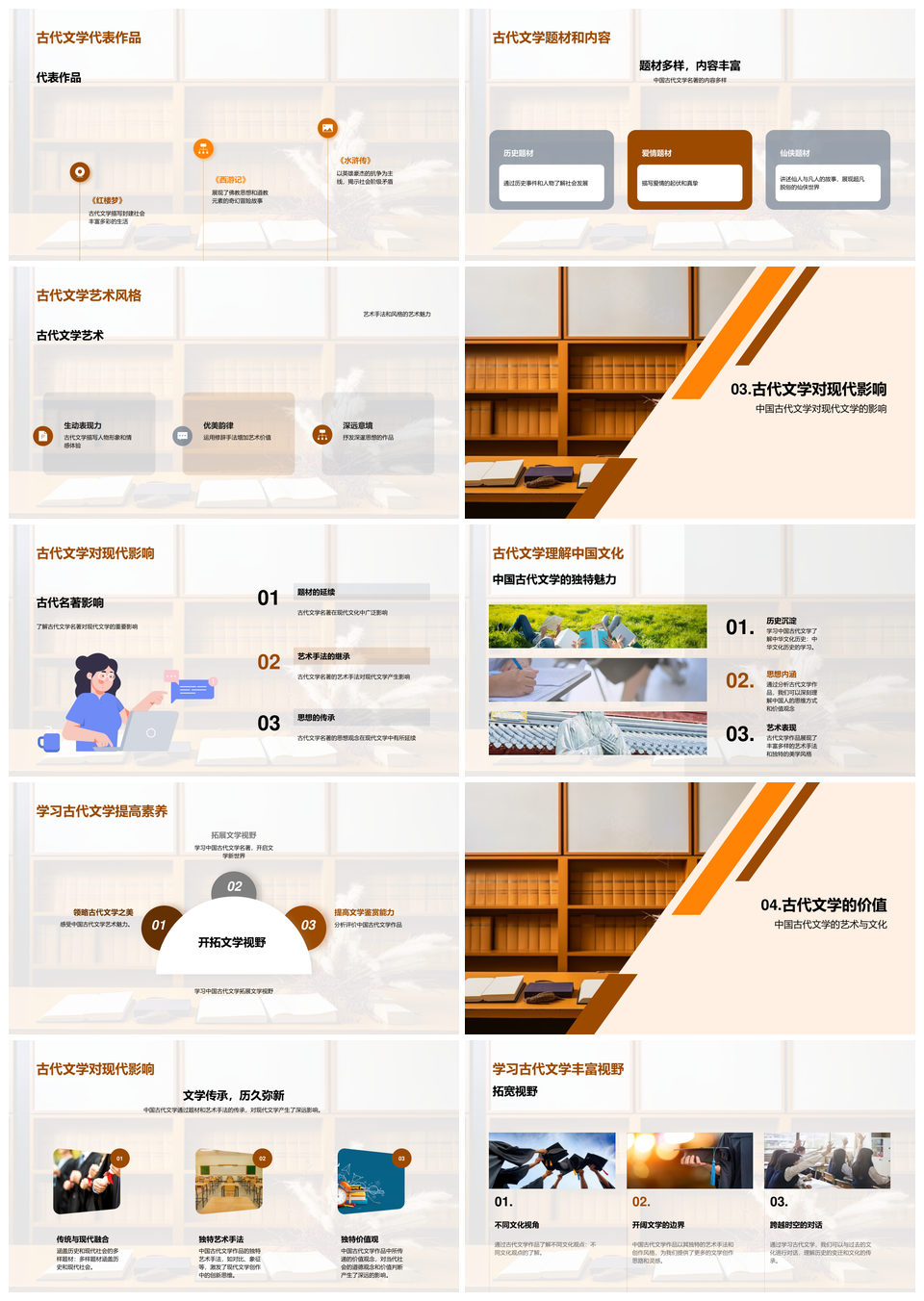 风云办公提供的中国古代文学名著特色题材及发展历程PPT模板,下载格式为pptx,一共23页,作品中文字及图均可以修改和编辑,图片更改请在作品中右键图片并更换,文字修改请直接点击文字进行修改。