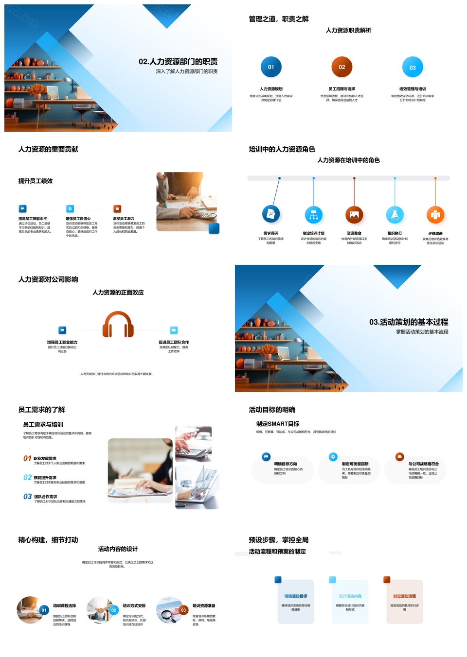 这是一张人力资源效能培训策划提升职业素养团队效率PPT模板,包含人力资源、效能培训、策划、提升、职业素养、团队效率等主题内容,也可用作人力资源效能培训策划、效能培训策划提升、培训策划提升职业素养、策划提升职业素养团队效率、人力资源培训策划提升、效能策划提升职业素养、培训提升职业素养团队效率、人力资源效能培训、效能培训策划、培训策划提升、策划提升职业素养、提升职业素养团队效率、人力资源效能培训策划、效能培训提升职业素养、培训策划职业素养团队效率等PPT场景使用。 风云办公提供的人力资源效能培训策划提升职业素养团队效率PPT模板,下载格式为pptx,一共29页,作品中文字及图均可以修改和编辑,图片更改请在作品中右键图片并更换,文字修改请直接点击文字进行修改。