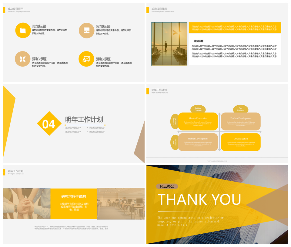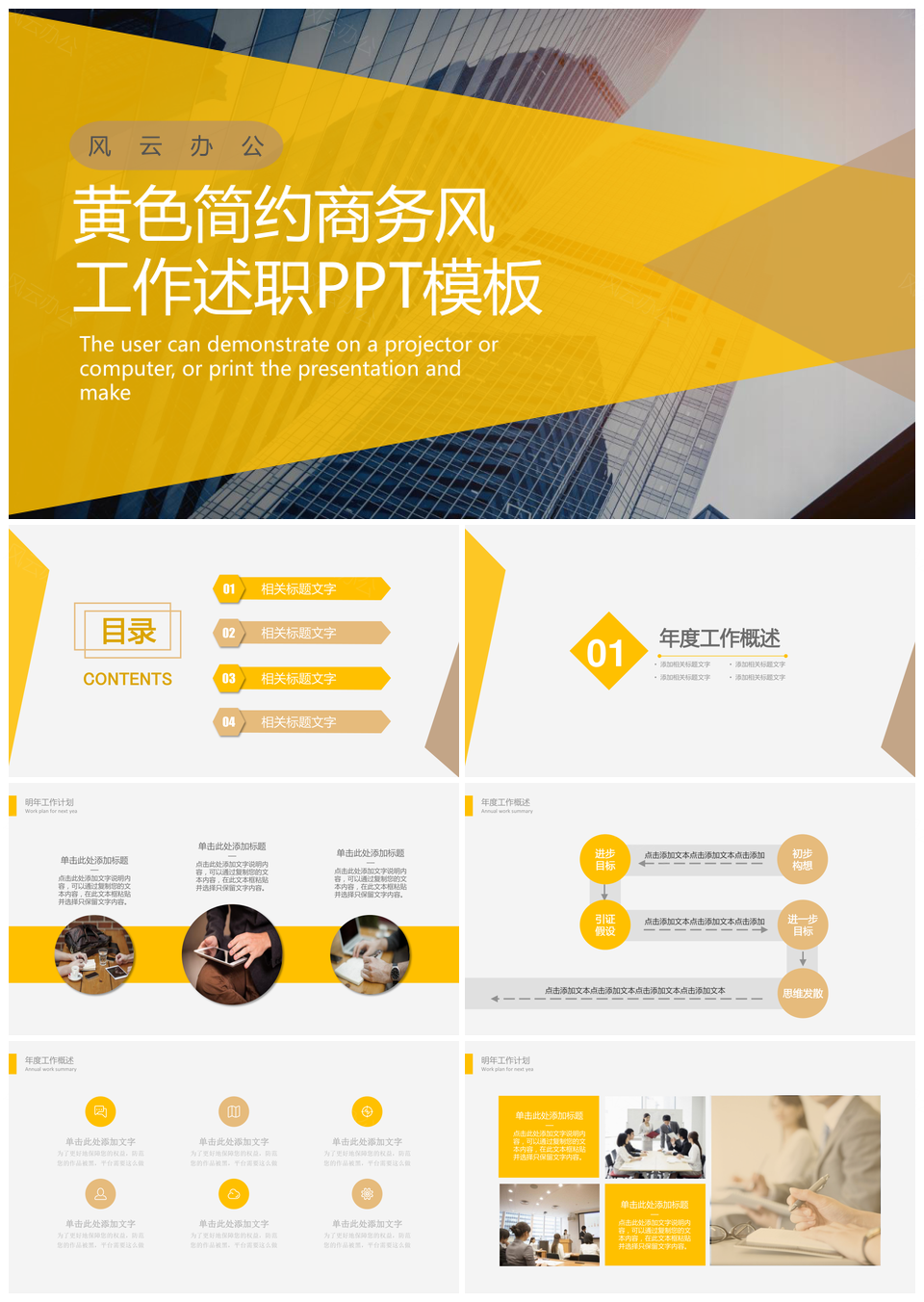 风云办公提供的黄色简约商务风工作述职PPT模板,下载格式为pptx,一共23页,作品中文字及图均可以修改和编辑,图片更改请在作品中右键图片并更换,文字修改请直接点击文字进行修改。