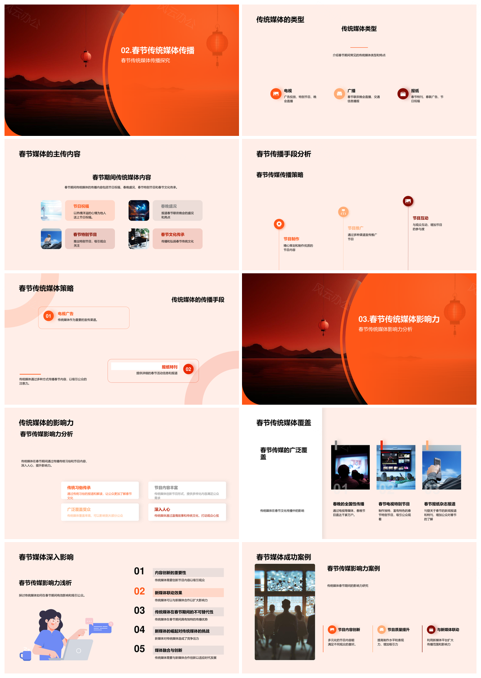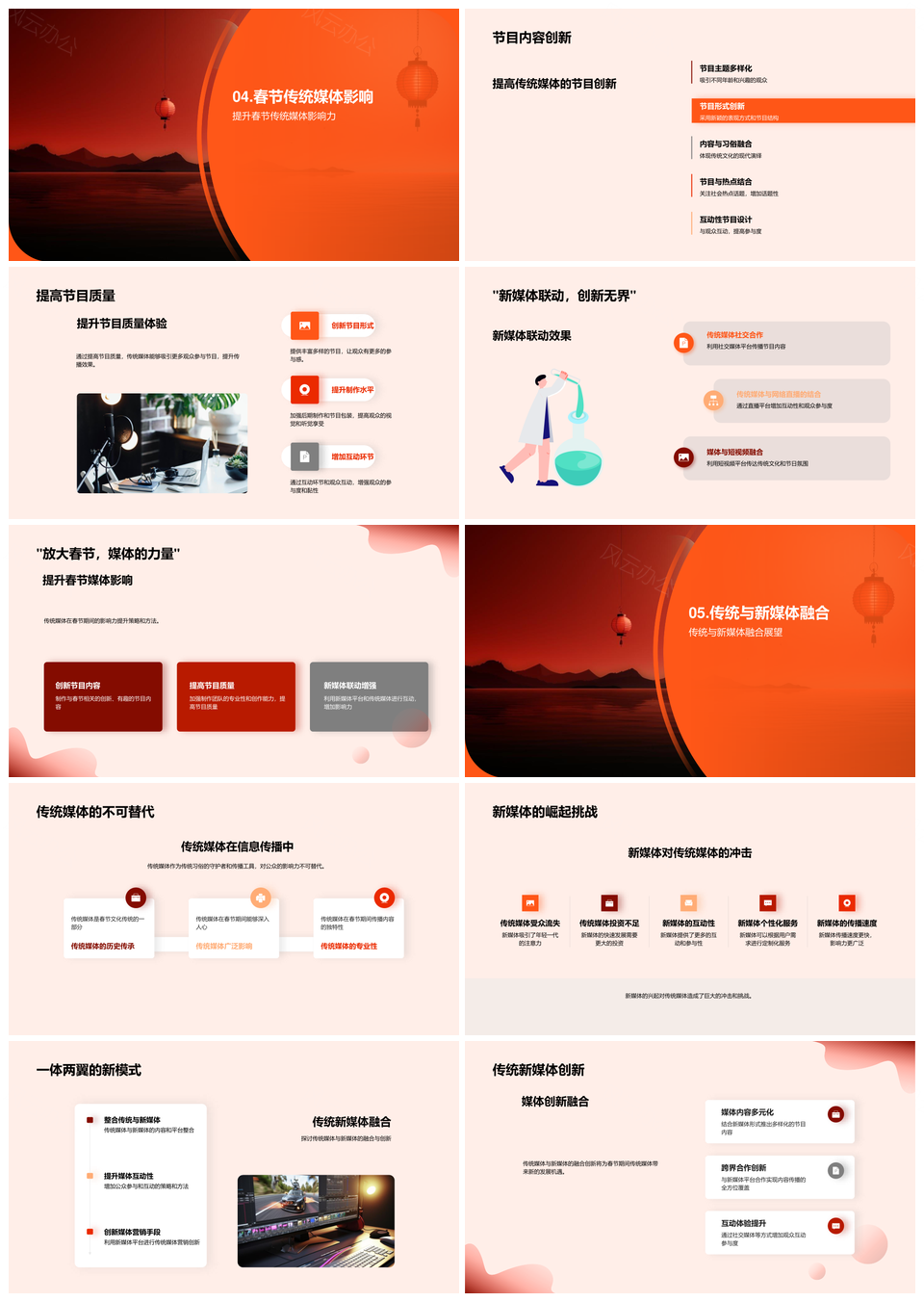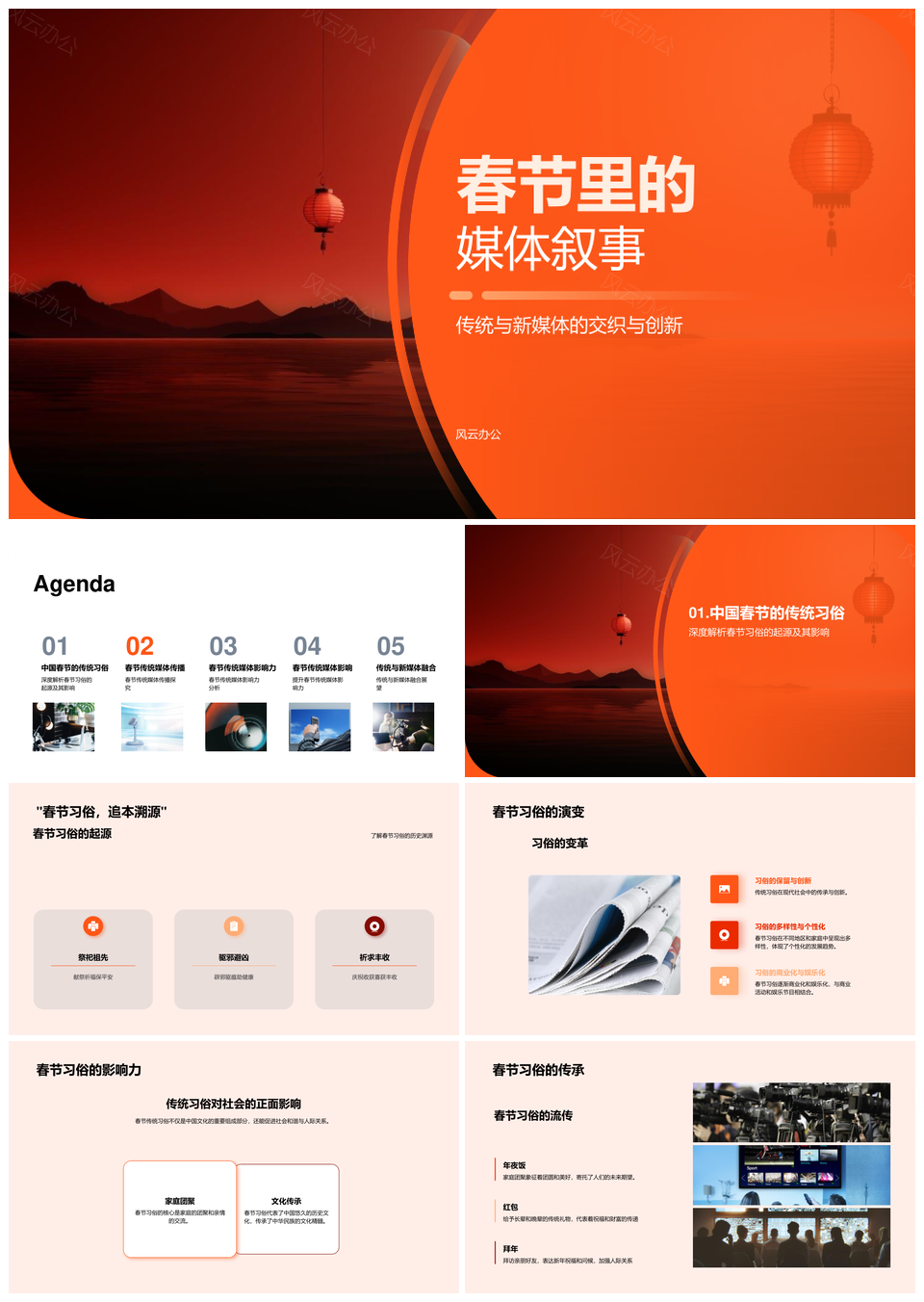 风云办公提供的春节传统新媒体叙事传播习俗节目灯笼PPT模板,下载格式为pptx,一共28页,作品中文字及图均可以修改和编辑,图片更改请在作品中右键图片并更换,文字修改请直接点击文字进行修改。