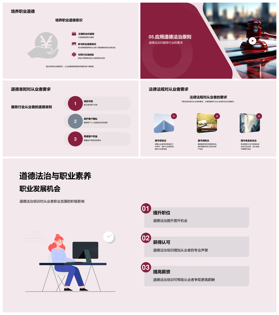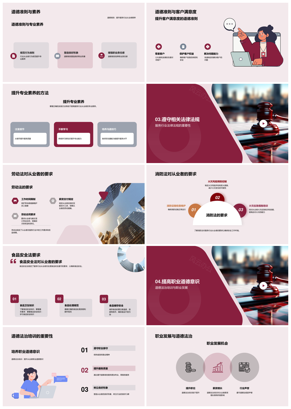 这是一张服务从业者法治道德铸专业素养PPT模板,包含服务从业者、法治道德、专业素养等主题内容,也可用作服务从业者法治道德、从业者法治道德专业、法治道德专业素养、服务从业者法治、从业者法治道德、法治道德专业、道德专业素养、服务从业者、从业者法治、法治道德、道德专业、专业素养等PPT场景使用。 风云办公提供的服务从业者法治道德铸专业素养PPT模板,下载格式为pptx,一共23页,作品中文字及图均可以修改和编辑,图片更改请在作品中右键图片并更换,文字修改请直接点击文字进行修改。
