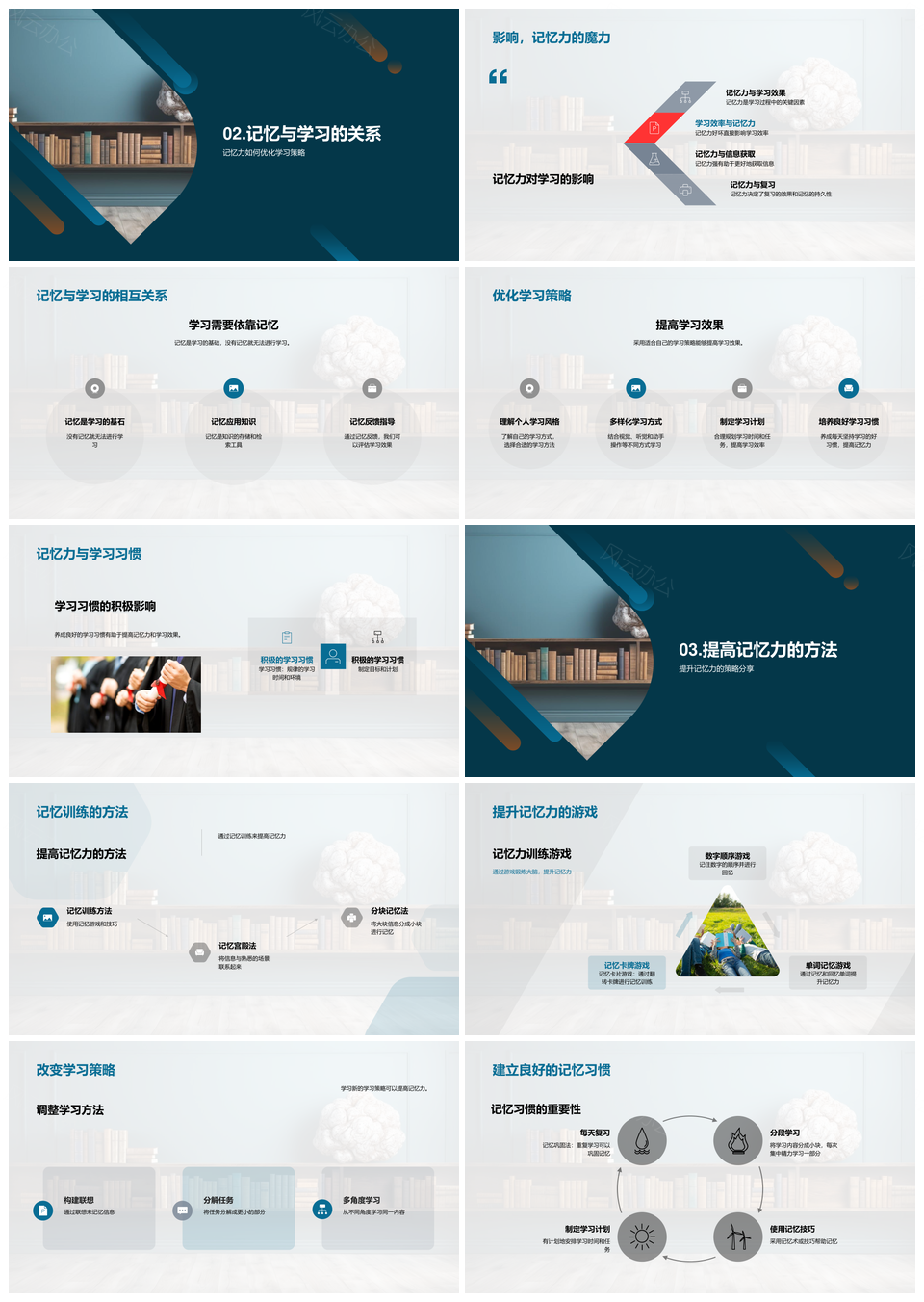 这是一张提升记忆力学习策略与大脑健康训练习惯PPT模板,包含提升、记忆力、学习、策略、大脑、健康、训练、习惯等主题内容,也可用作提升记忆力学习策略大脑健康、提升记忆力大脑健康训练习惯、提升记忆力学习策略、记忆力学习策略大脑健康、学习策略大脑健康训练习惯、大脑健康训练习惯提升、提升大脑健康训练习惯、提升记忆力、学习策略大脑健康、大脑健康训练习惯、记忆力学习策略、提升大脑健康、学习策略训练习惯、记忆力大脑健康、提升训练习惯等PPT场景使用。 风云办公提供的提升记忆力学习策略与大脑健康训练习惯PPT模板,下载格式为pptx,一共28页,作品中文字及图均可以修改和编辑,图片更改请在作品中右键图片并更换,文字修改请直接点击文字进行修改。