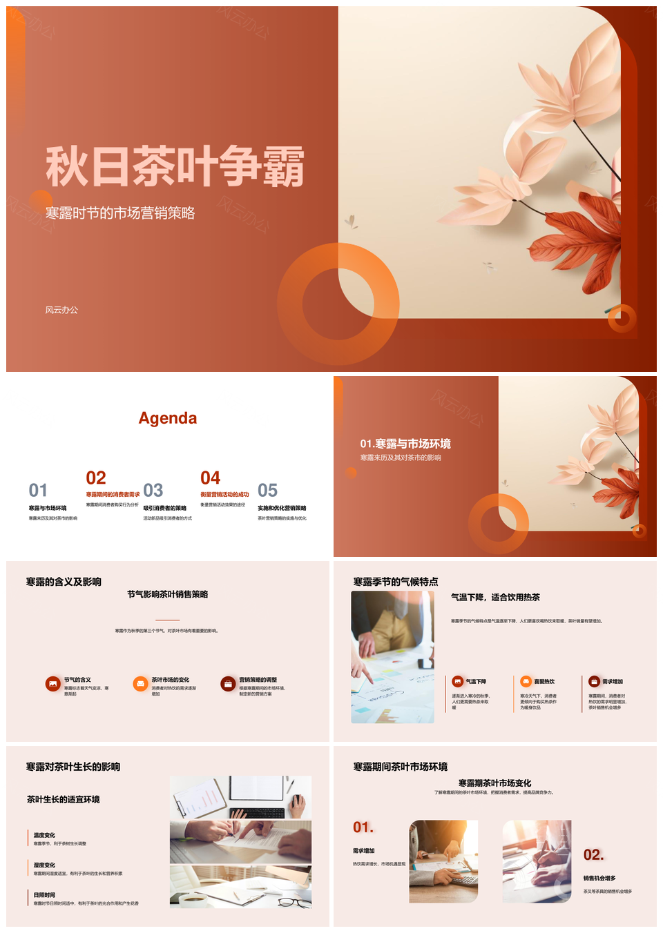 风云办公提供的寒露茶市争霸品牌新品秋叶茶文化活动PPT模板,下载格式为pptx,一共28页,作品中文字及图均可以修改和编辑,图片更改请在作品中右键图片并更换,文字修改请直接点击文字进行修改。