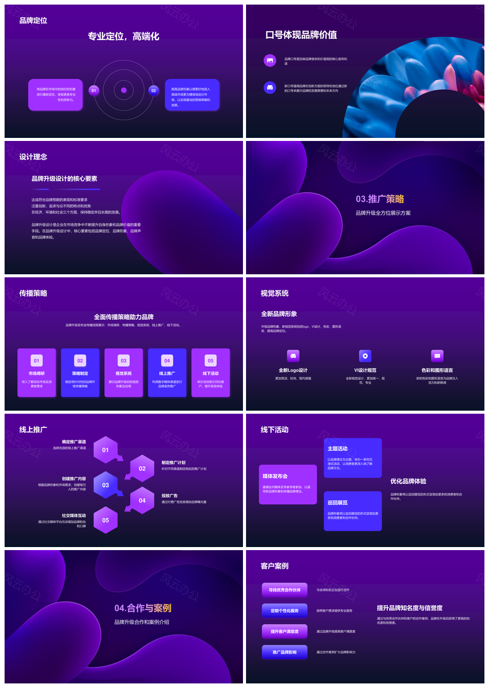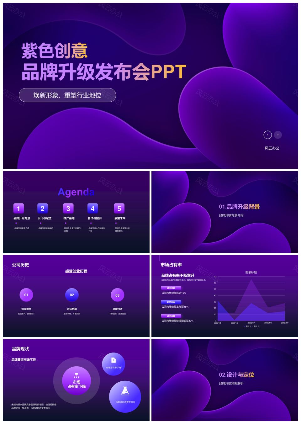 风云办公提供的紫色互联网品牌升级发布会PPT模板,下载格式为pptx,一共20页,作品中文字及图均可以修改和编辑,图片更改请在作品中右键图片并更换,文字修改请直接点击文字进行修改。