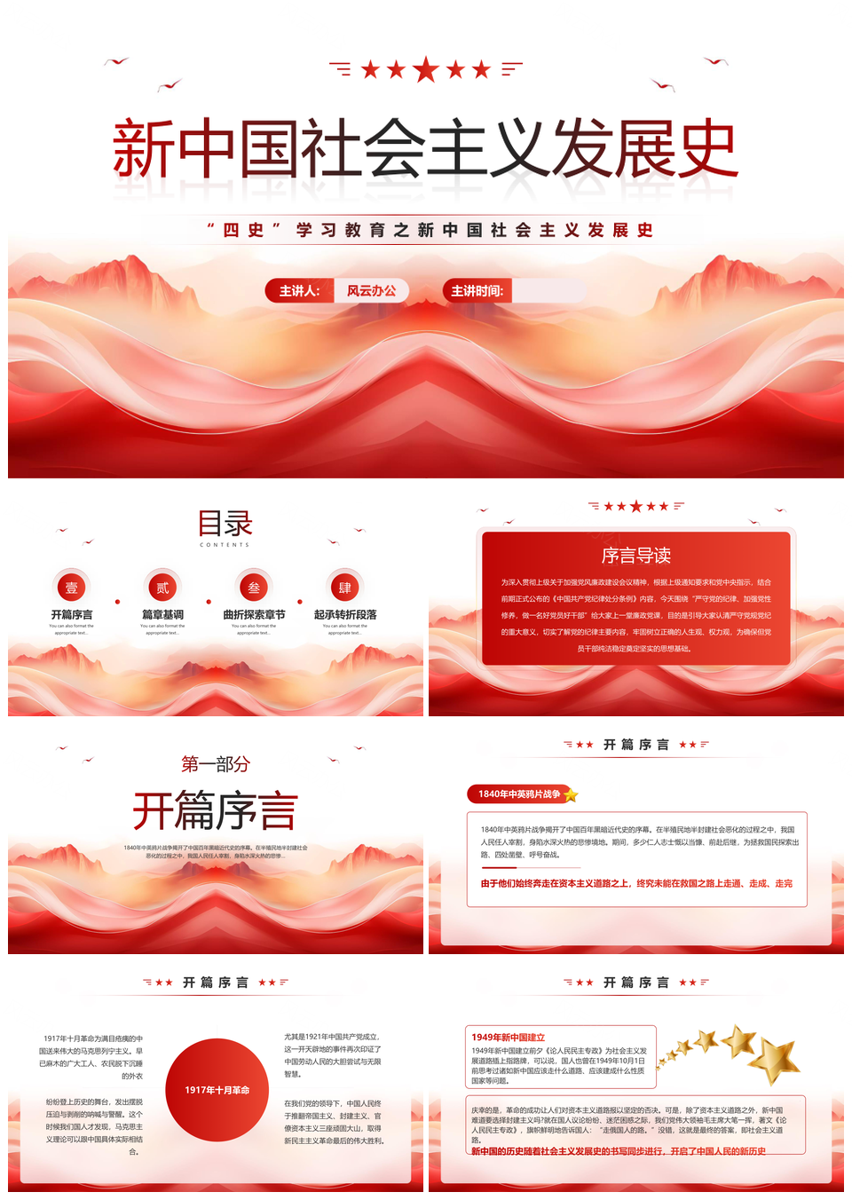 风云办公提供的红色党建四史社会主义发展史主题教育党课课件,下载格式为pptx,一共22页,作品中文字及图均可以修改和编辑,图片更改请在作品中右键图片并更换,文字修改请直接点击文字进行修改。