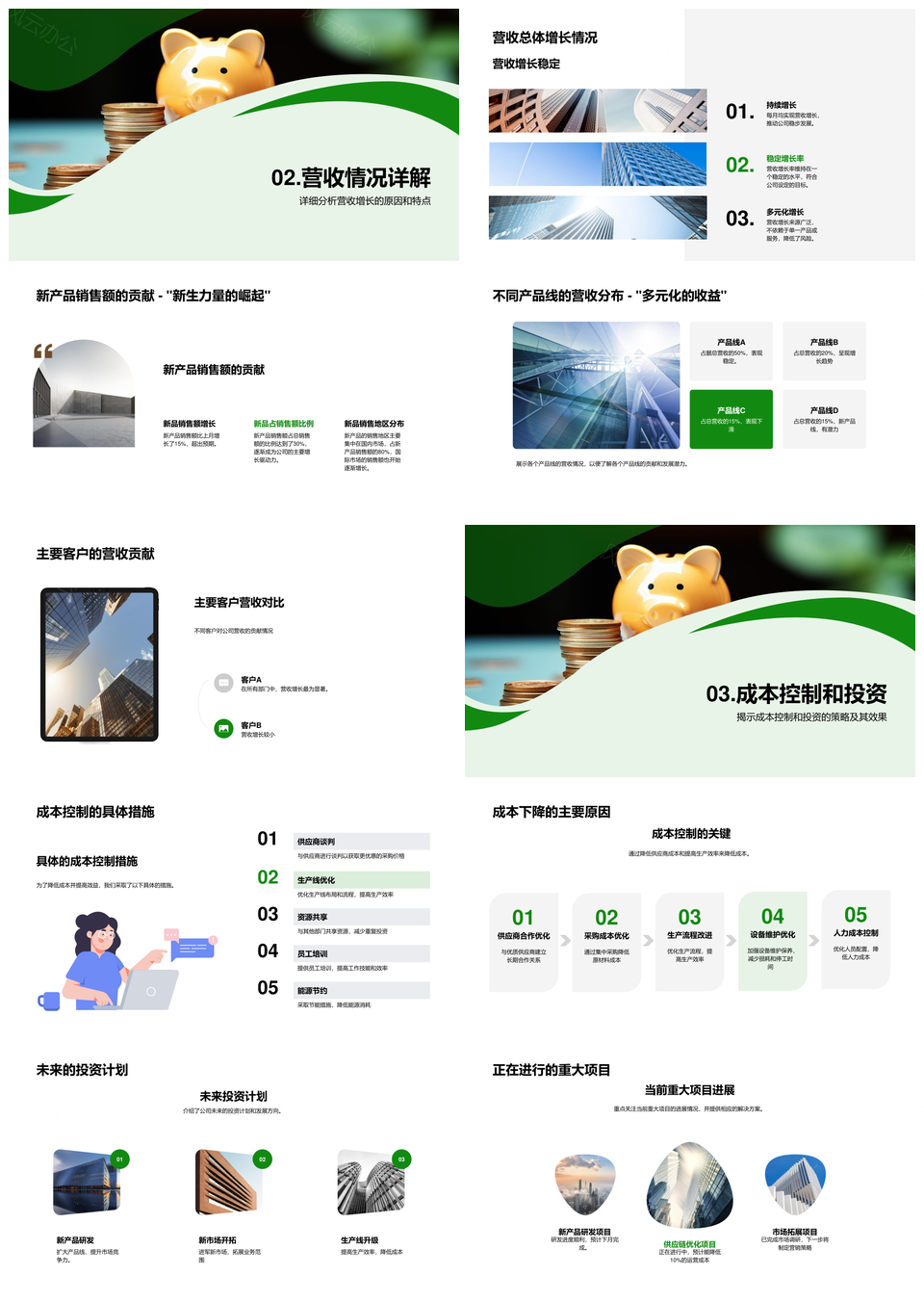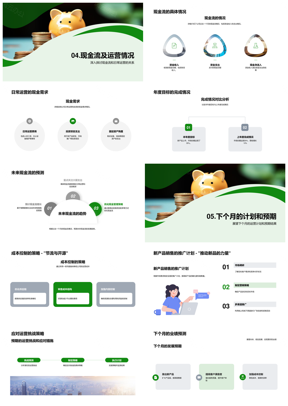 这是一张公司财务运营月报分析规划发展营收成本现金流增长PPT模板,包含公司、财务、运营、月报、分析、规划、发展、营收、成本、现金流、增长等主题内容,也可用作公司财务运营月报分析、财务运营月报分析规划、运营月报分析规划发展、月报分析规划发展营收、分析规划发展营收成本、规划发展营收成本现金流、发展营收成本现金流增长、公司财务运营月报、财务运营月报分析、运营月报分析规划、月报分析规划发展、分析规划发展营收、规划发展营收成本、发展营收成本现金流、营收成本现金流增长等PPT场景使用。 风云办公提供的公司财务运营月报分析规划发展营收成本现金流增长PPT模板,下载格式为pptx,一共28页,作品中文字及图均可以修改和编辑,图片更改请在作品中右键图片并更换,文字修改请直接点击文字进行修改。