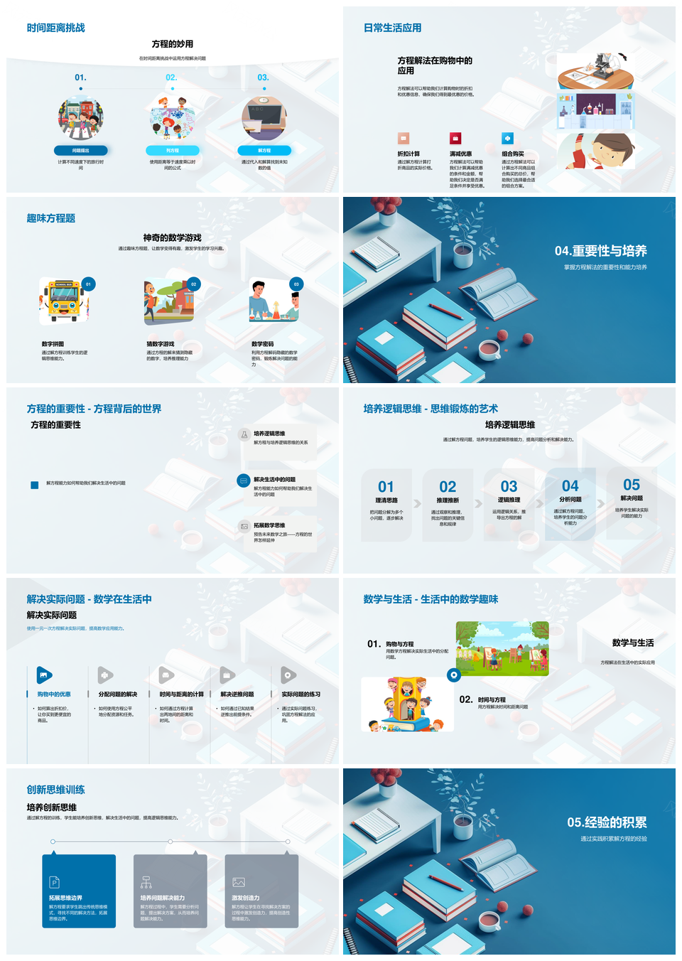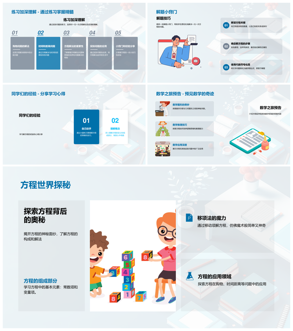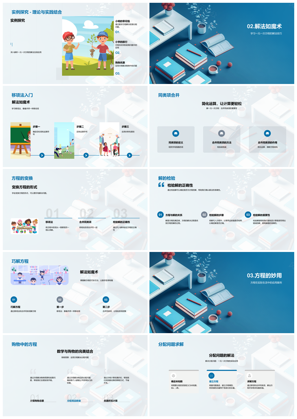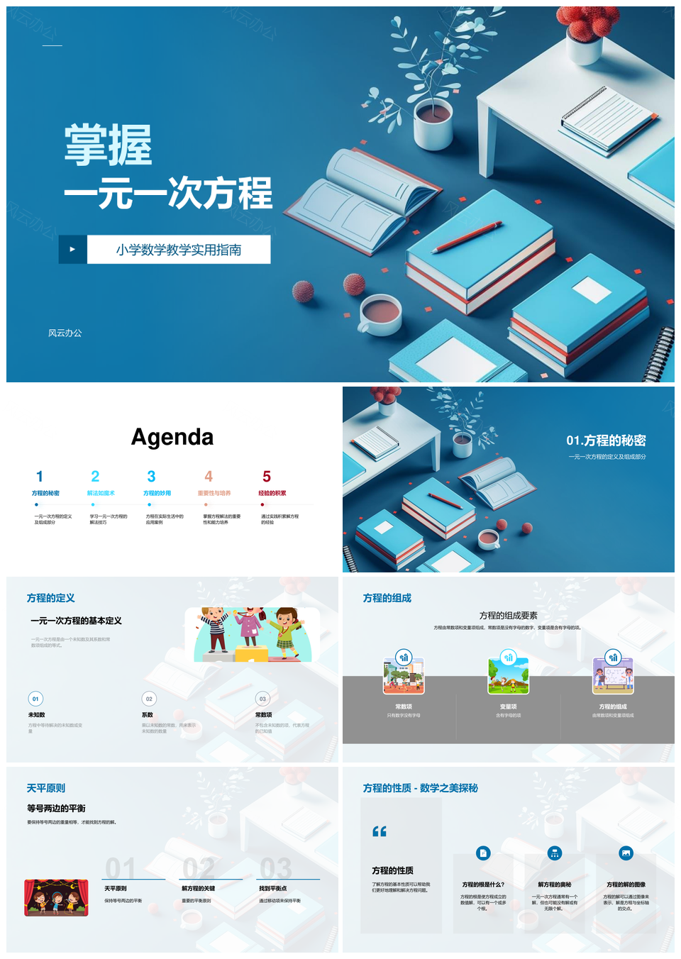 这是一张小学数学一元一次方程移项合并解法教学检验PPT模板,包含小学数学、一元一次方程、移项、合并、解法、教学、检验等主题内容,也可用作小学数学一元一次方程解法、一元一次方程移项合并解法、方程移项合并解法教学、移项合并解法教学检验、数学一元一次方程解法教学、移项合并解法教学、解法教学检验、数学教学检验、一元一次方程解法、方程移项合并、移项合并解法、合并解法教学、数学解法检验、教学检验、解法检验等PPT场景使用。 风云办公提供的小学数学一元一次方程移项合并解法教学检验PPT模板,下载格式为pptx,一共33页,作品中文字及图均可以修改和编辑,图片更改请在作品中右键图片并更换,文字修改请直接点击文字进行修改。