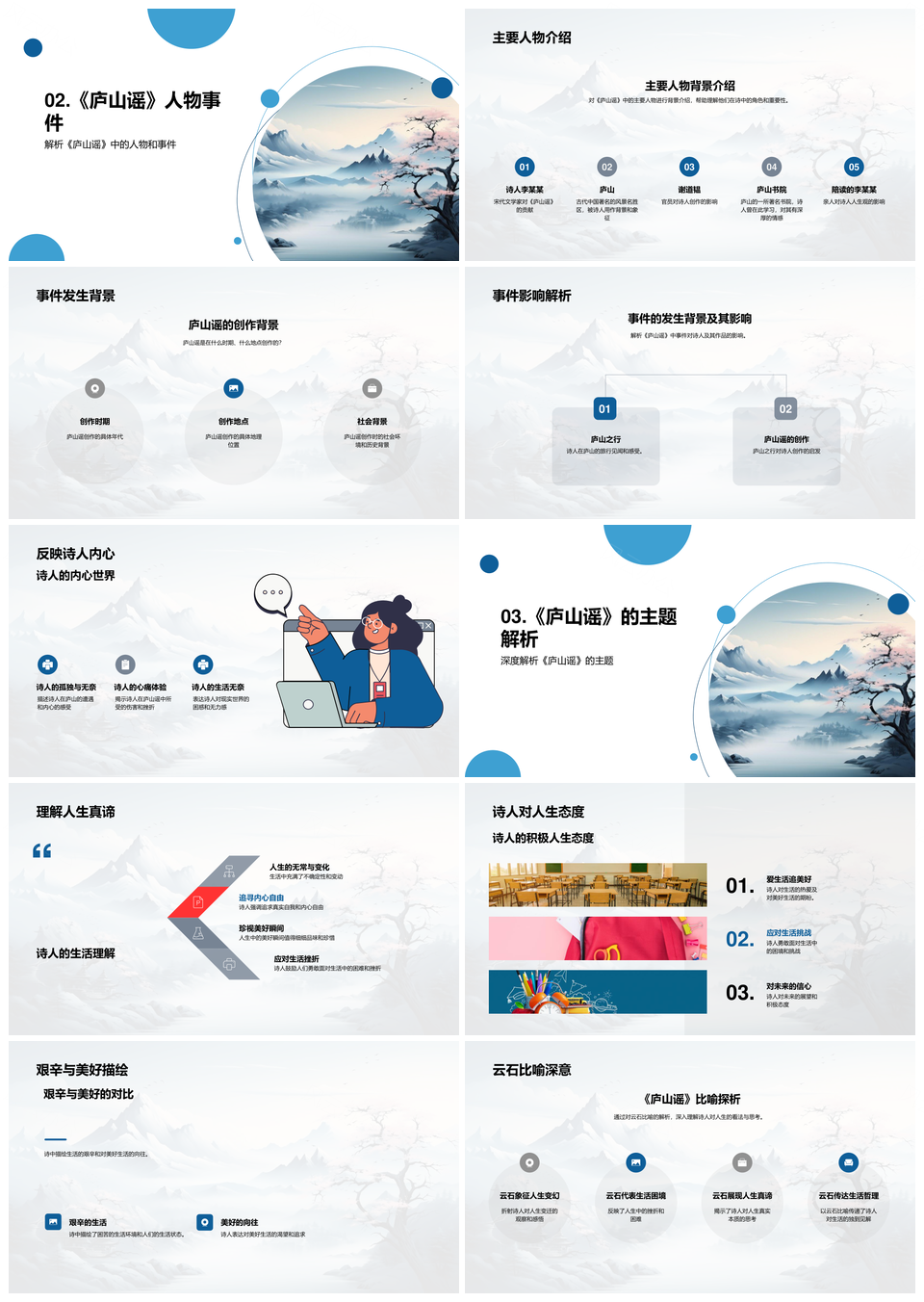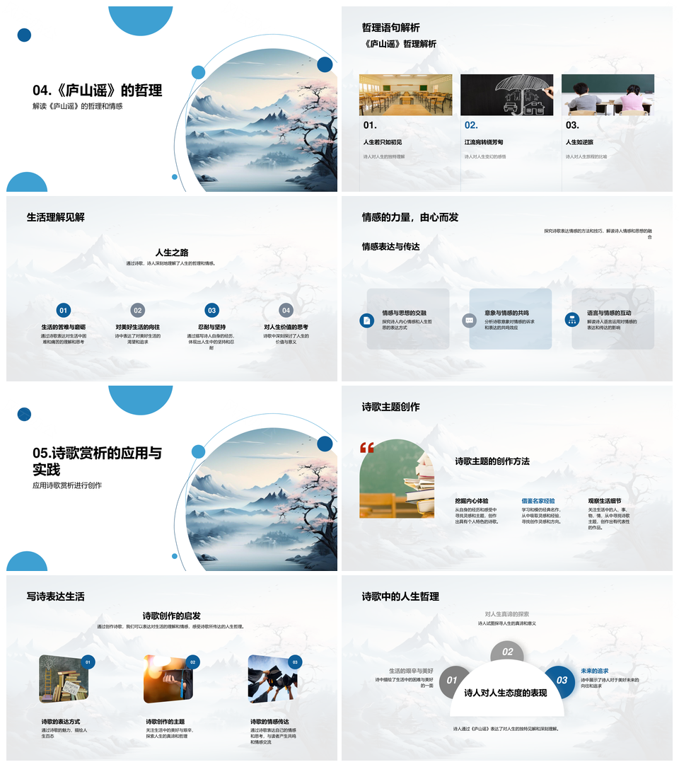 风云办公提供的庐山谣诗人情感哲理与时代山景解析PPT模板,下载格式为pptx,一共26页,作品中文字及图均可以修改和编辑,图片更改请在作品中右键图片并更换,文字修改请直接点击文字进行修改。