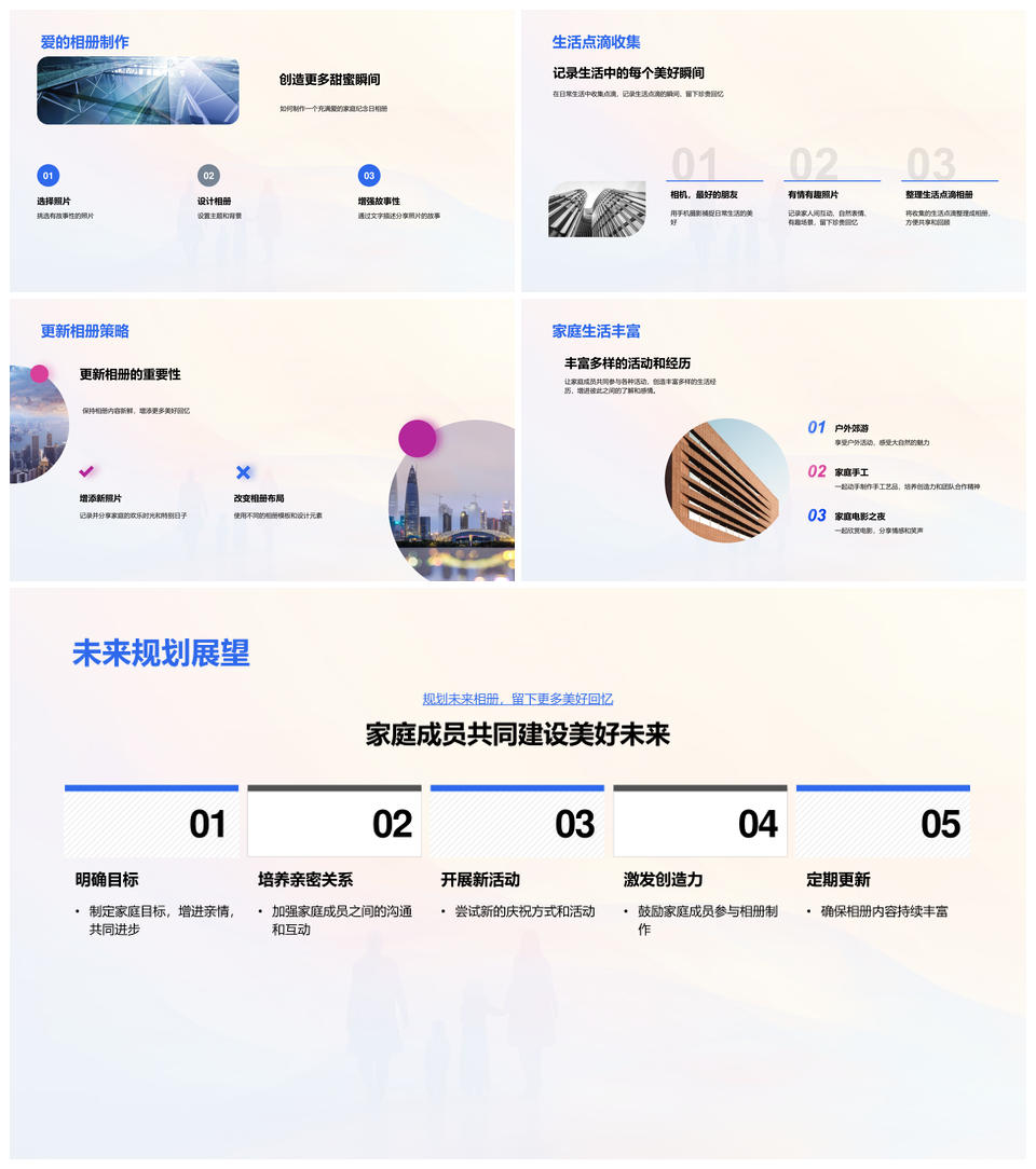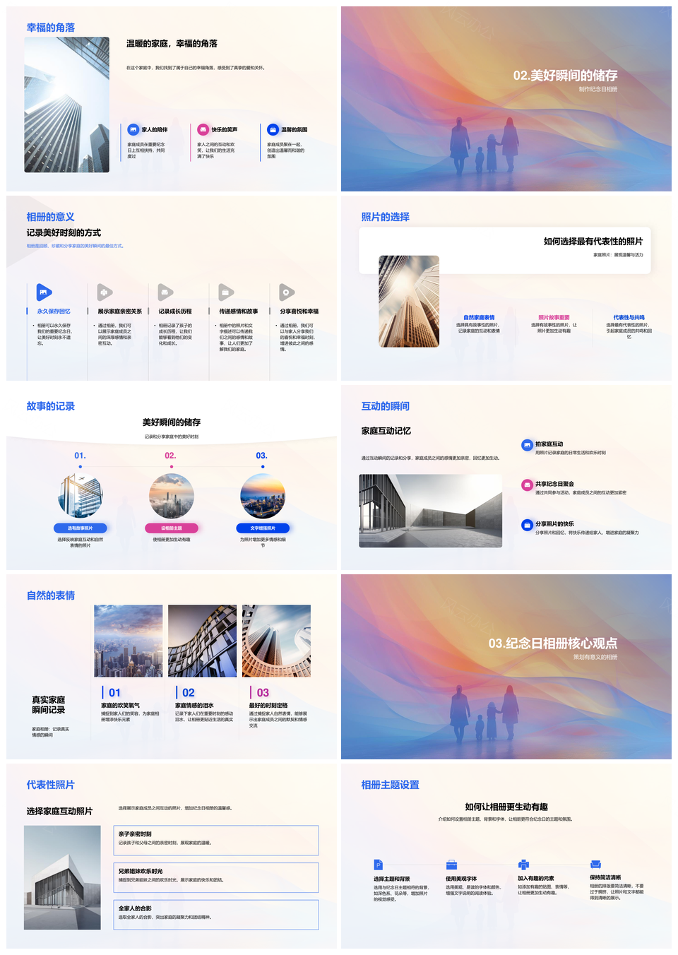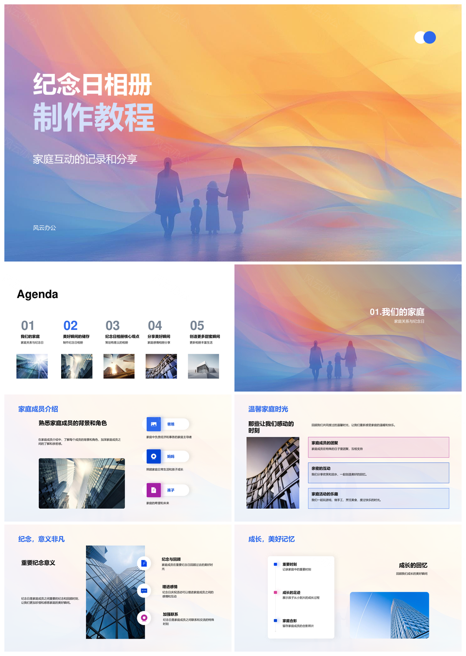 风云办公提供的家庭互动重要纪念日相册制作教程PPT模板,下载格式为pptx,一共33页,作品中文字及图均可以修改和编辑,图片更改请在作品中右键图片并更换,文字修改请直接点击文字进行修改。