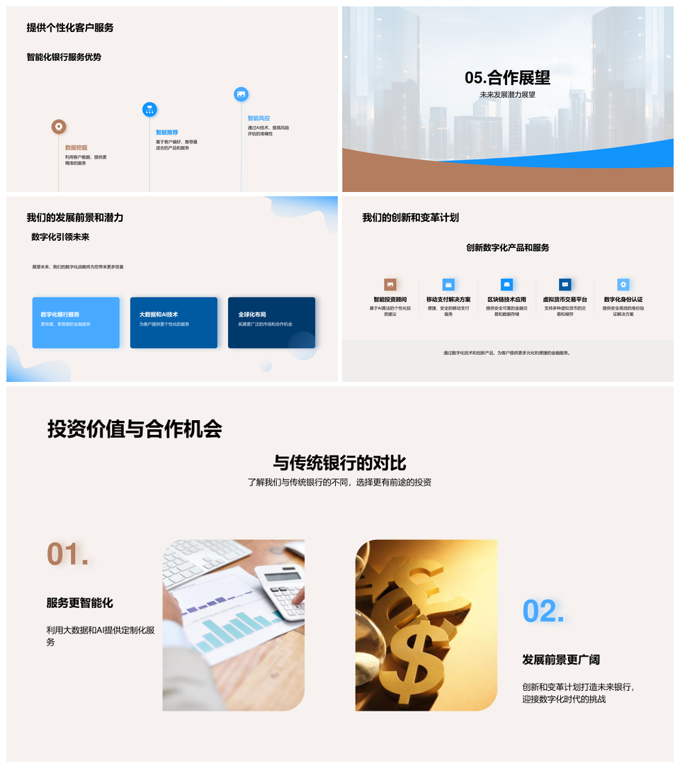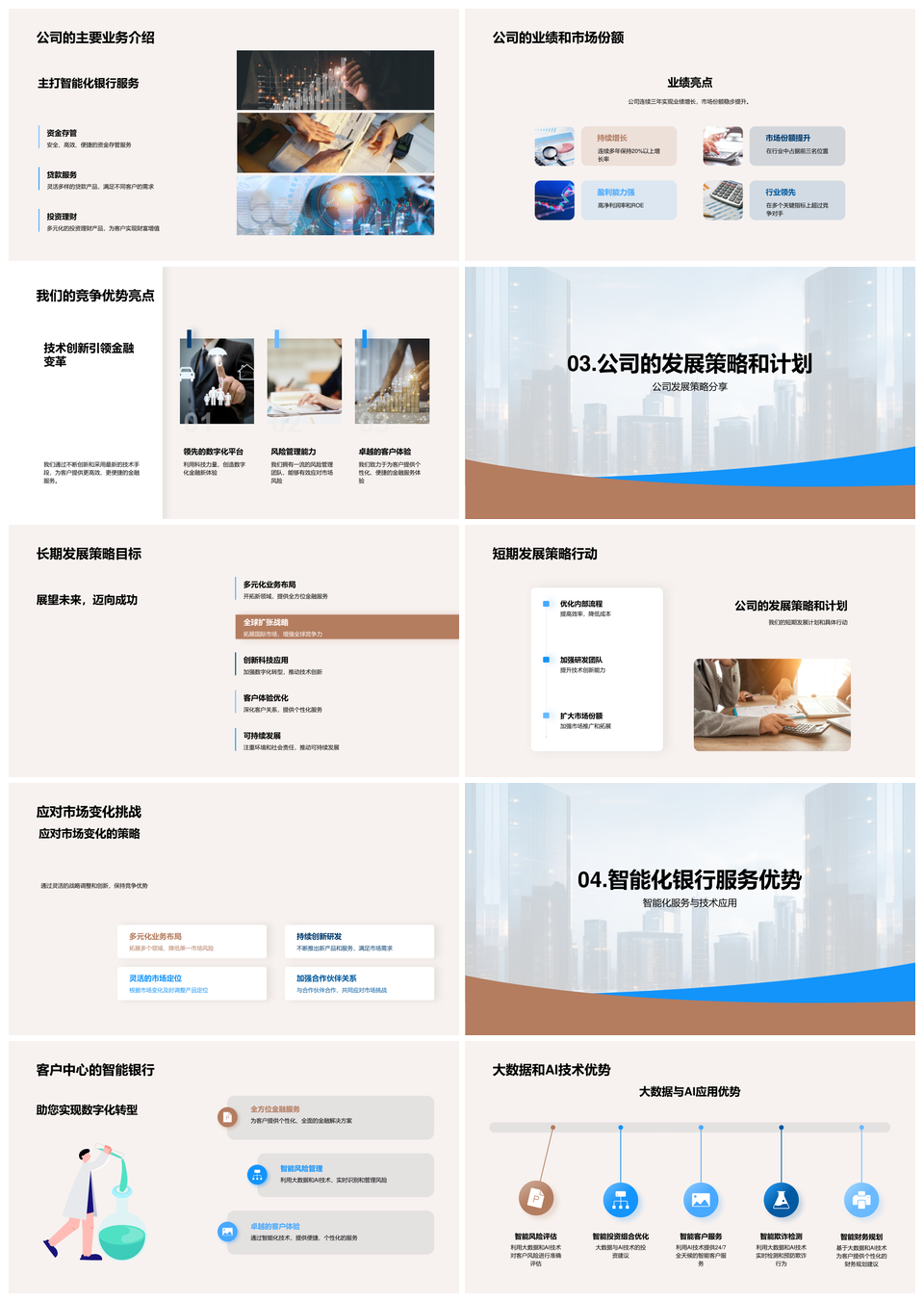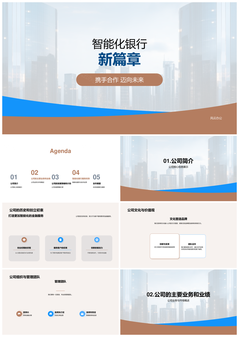 风云办公提供的智能银行AI大数据战略引资创新变革PPT模板,下载格式为pptx,一共23页,作品中文字及图均可以修改和编辑,图片更改请在作品中右键图片并更换,文字修改请直接点击文字进行修改。