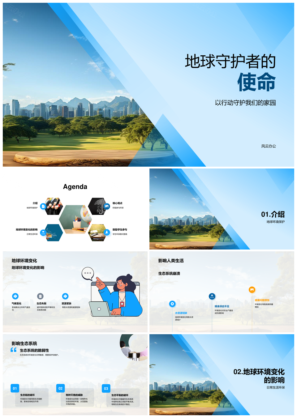 风云办公提供的地球守护者谈气候植被水资源环保PPT模板,下载格式为pptx,一共19页,作品中文字及图均可以修改和编辑,图片更改请在作品中右键图片并更换,文字修改请直接点击文字进行修改。