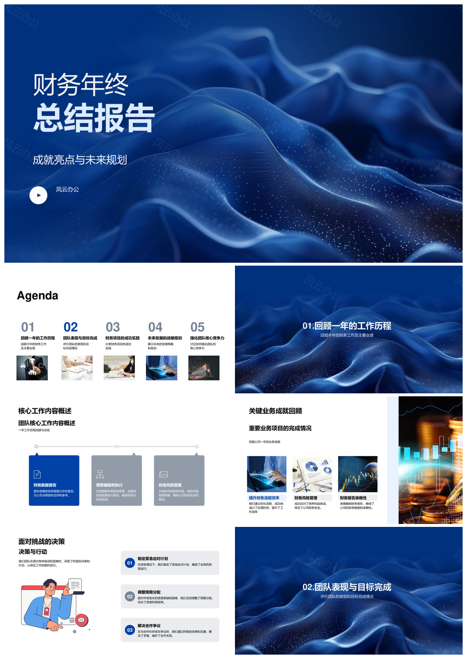 风云办公提供的财务年终总结核心工作及关键业务成就PPT模板,下载格式为pptx,一共24页,作品中文字及图均可以修改和编辑,图片更改请在作品中右键图片并更换,文字修改请直接点击文字进行修改。