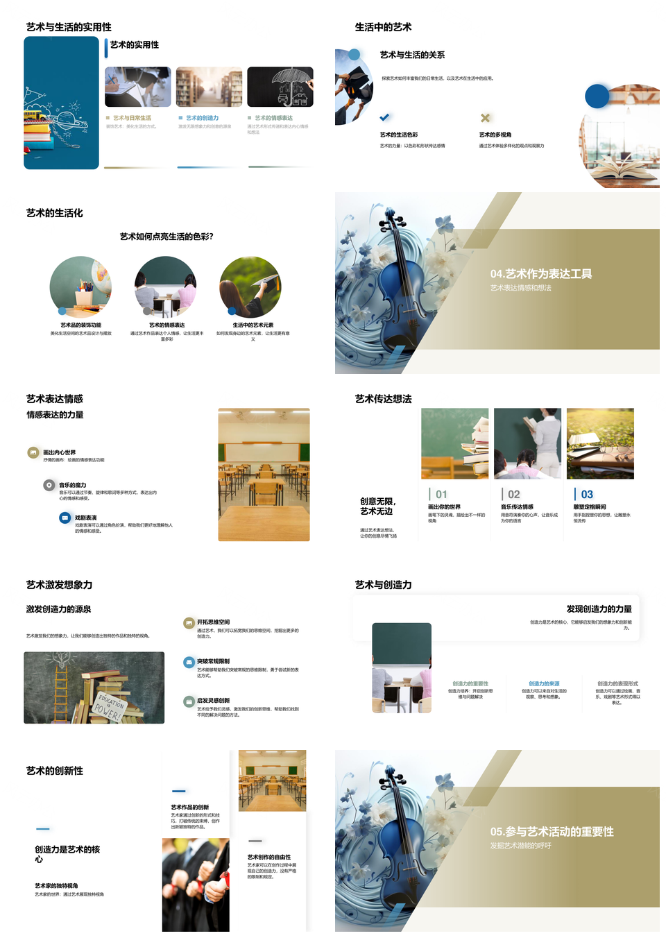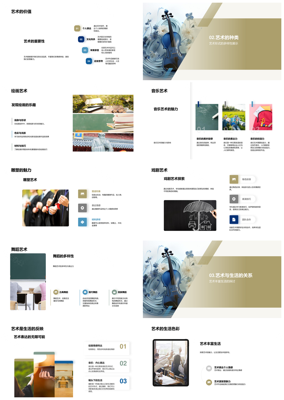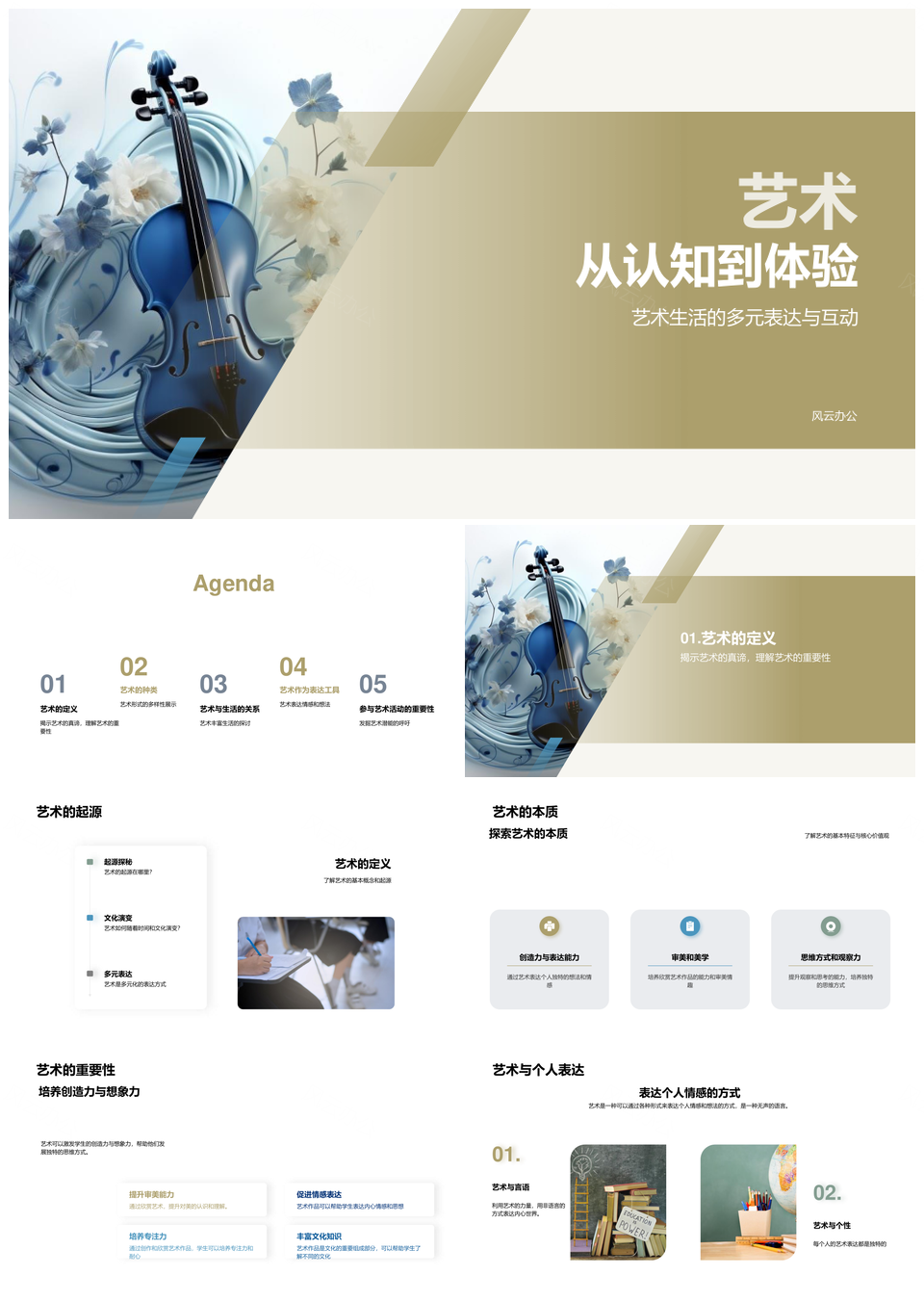 风云办公提供的艺术多元表达从认知到体验PPT模板,下载格式为pptx,一共33页,作品中文字及图均可以修改和编辑,图片更改请在作品中右键图片并更换,文字修改请直接点击文字进行修改。