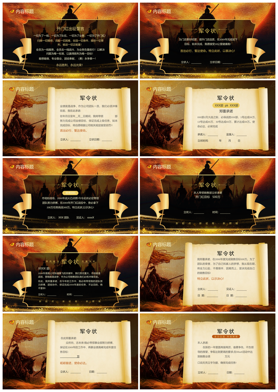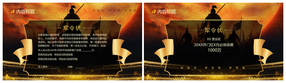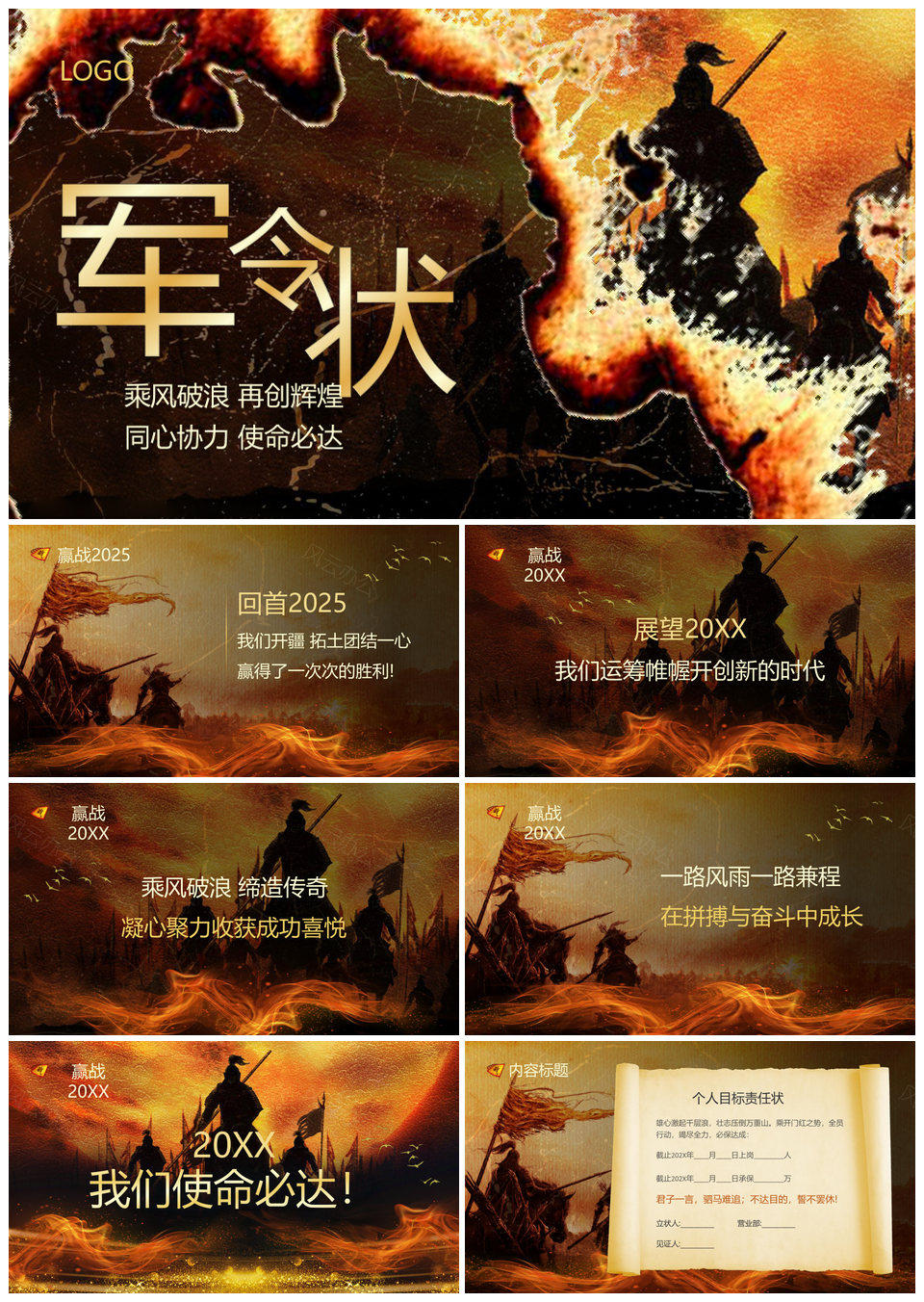 这是一张黑金古风军令状赢战2024企业冲锋使命团队PPT模板,包含黑金、古风、军令状、赢战、2024、企业、冲锋、使命、团队等主题内容,也可用作黑金古风军令状赢战、古风军令状赢战2024、军令状赢战2024企业、赢战2024企业冲锋、2024企业冲锋使命、企业冲锋使命团队、黑金古风军令状、古风军令状赢战、军令状赢战2024、赢战2024企业、2024企业冲锋、企业冲锋使命、冲锋使命团队、黑金古风、古风军令状等PPT场景使用。 风云办公提供的黑金古风军令状赢战2024企业冲锋使命团队PPT模板,下载格式为pptx,一共20页,作品中文字及图均可以修改和编辑,图片更改请在作品中右键图片并更换,文字修改请直接点击文字进行修改。