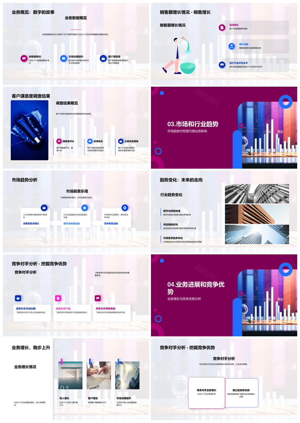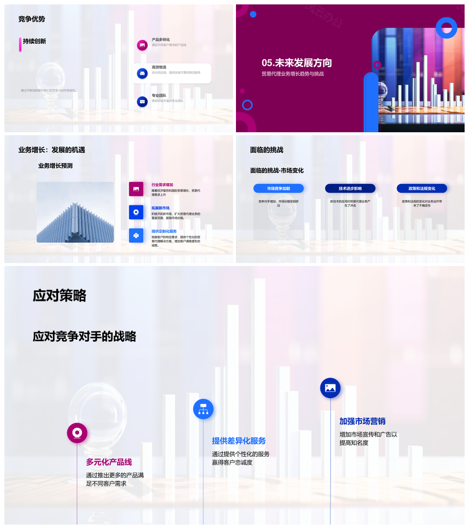 这是一张贸易代理年中总结业务增长市场趋势竞争优势PPT模板,包含贸易代理、年中总结、业务增长、市场趋势、竞争优势等主题内容,也可用作贸易代理年中总结业务增长市场趋势、年中总结业务增长市场趋势竞争优势、贸易代理业务增长市场趋势竞争优势、贸易代理年中总结市场趋势竞争优势、贸易代理年中总结业务增长竞争优势、贸易代理年中总结业务增长、业务增长市场趋势竞争优势、贸易代理业务增长市场趋势、年中总结市场趋势竞争优势、贸易代理市场趋势竞争优势、业务增长市场趋势、贸易代理竞争优势、年中总结业务增长、市场趋势竞争优势、贸易代理年中总结等PPT场景使用。 风云办公提供的贸易代理年中总结业务增长市场趋势竞争优势PPT模板,下载格式为pptx,一共23页,作品中文字及图均可以修改和编辑,图片更改请在作品中右键图片并更换,文字修改请直接点击文字进行修改。