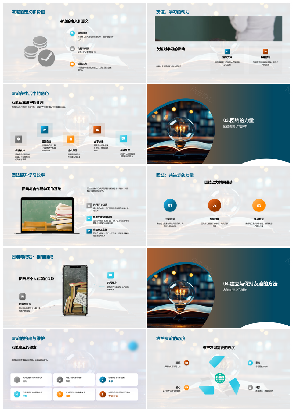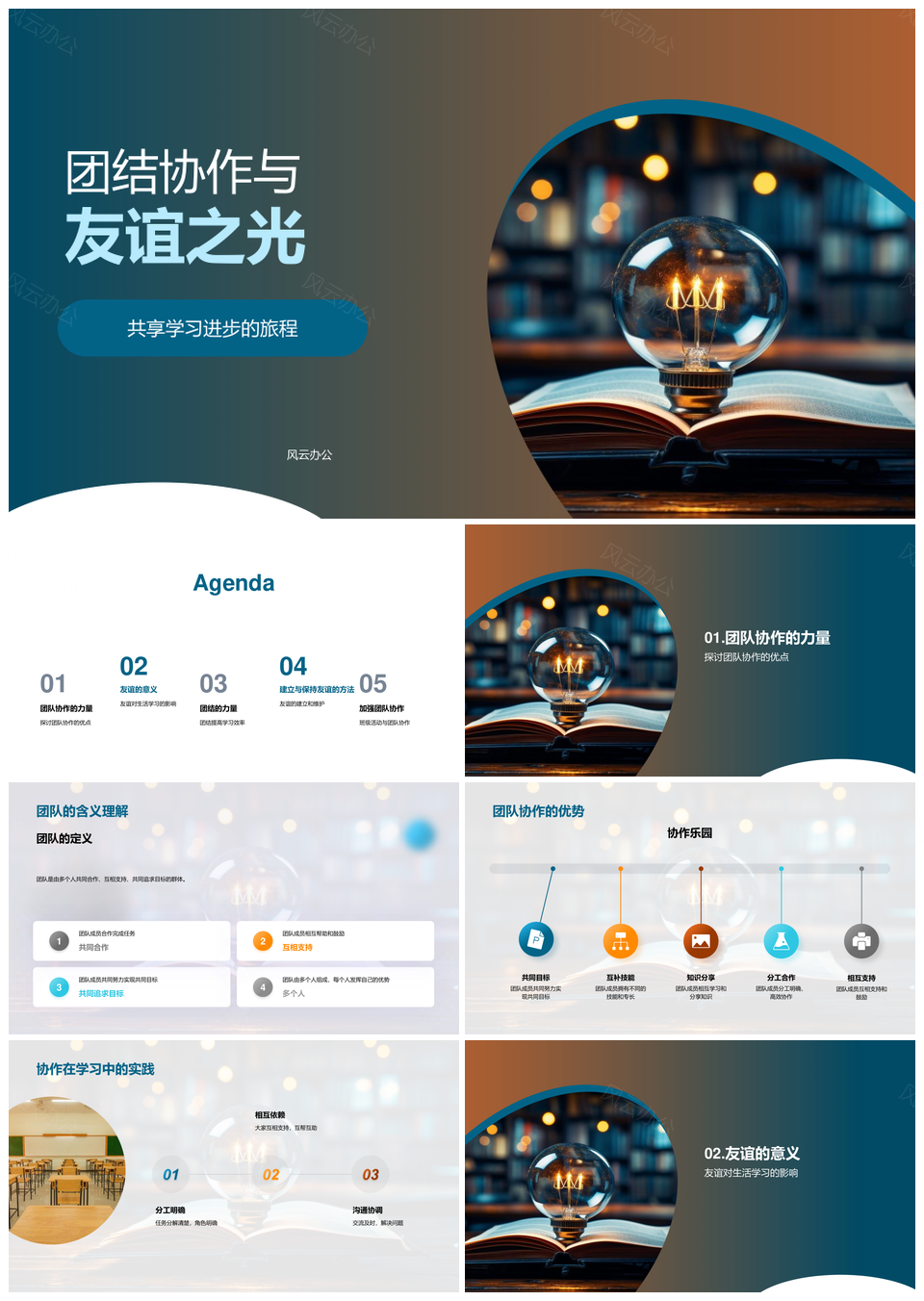风云办公提供的团结协作友谊共享学习PPT模板,下载格式为pptx,一共23页,作品中文字及图均可以修改和编辑,图片更改请在作品中右键图片并更换,文字修改请直接点击文字进行修改。