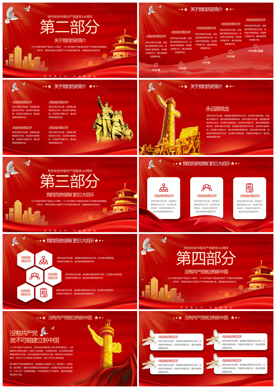这是一张2025静态红色建党100周年党政宣传PPT模板,包含静态、红色、建党100周年、党政宣传等主题内容,也可用作红色建党100周年党政宣传、红色建党100周年宣传、建党100周年党政宣传、红色党政宣传、建党100周年宣传、红色建党100周年、党政宣传、建党100周年、红色建党、静态红色等PPT场景使用。 风云办公提供的2025静态红色建党100周年党政宣传PPT模板,下载格式为pptx,一共18页,作品中文字及图均可以修改和编辑,图片更改请在作品中右键图片并更换,文字修改请直接点击文字进行修改。