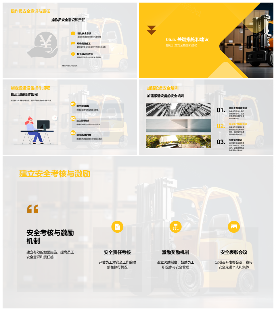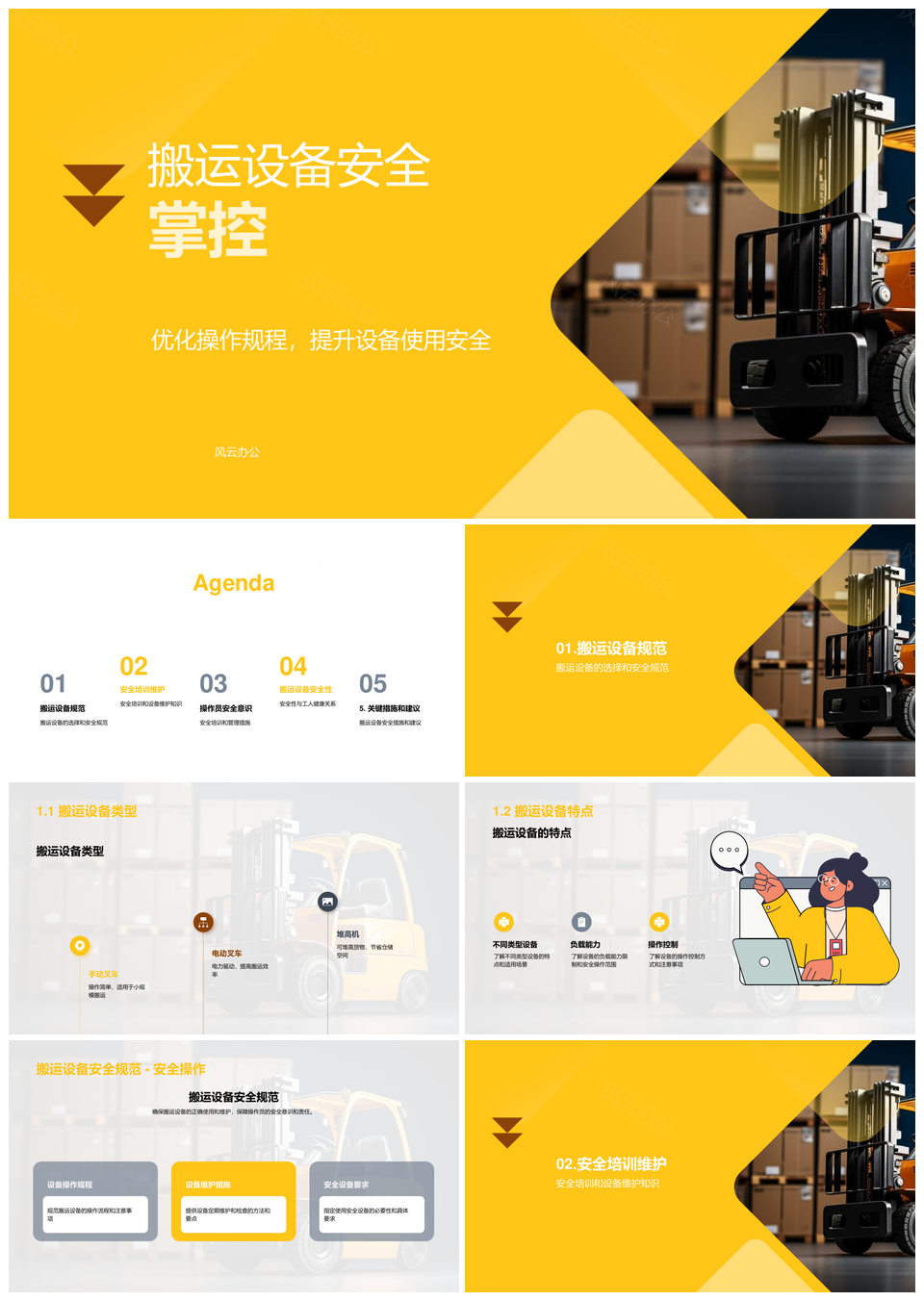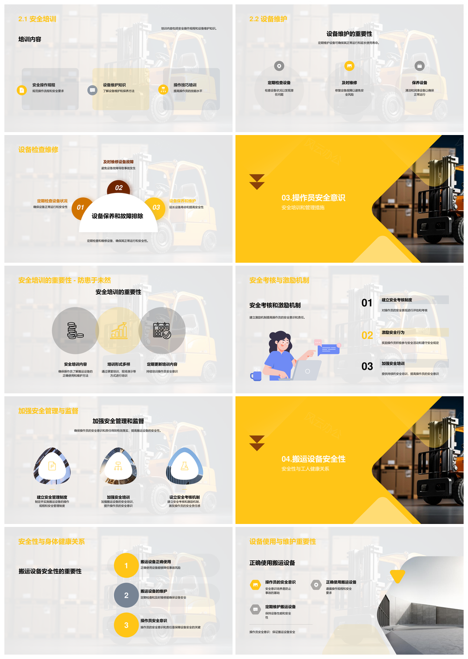 这是一张搬运设备叉车安全操作规范培训维护检查维修PPT模板,包含搬运设备、叉车、安全操作规范、培训、维护、检查、维修等主题内容,也可用作搬运设备叉车安全操作规范、叉车安全操作规范培训、安全操作规范培训维护、操作规范培训维护检查、培训维护检查维修、搬运设备叉车安全操作、设备叉车安全操作规范、叉车安全操作培训维护、安全操作培训维护检查、维护检查维修、搬运设备叉车安全、设备叉车操作规范、叉车操作规范培训、安全规范培训维护、操作培训维护检查等PPT场景使用。 风云办公提供的搬运设备叉车安全操作规范培训维护检查维修PPT模板,下载格式为pptx,一共23页,作品中文字及图均可以修改和编辑,图片更改请在作品中右键图片并更换,文字修改请直接点击文字进行修改。
