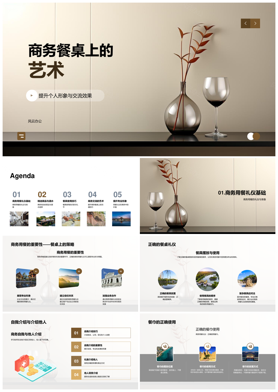 风云办公提供的商务宴请礼仪选品雅艺餐饮艺术PPT模板,下载格式为pptx,一共28页,作品中文字及图均可以修改和编辑,图片更改请在作品中右键图片并更换,文字修改请直接点击文字进行修改。
