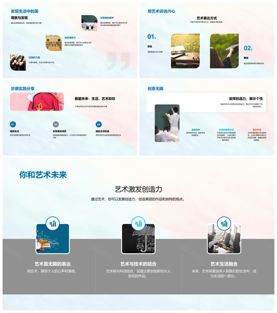 风云办公提供的儿童水彩纹理观察力艺术教学PPT模板,下载格式为pptx,一共33页,作品中文字及图均可以修改和编辑,图片更改请在作品中右键图片并更换,文字修改请直接点击文字进行修改。