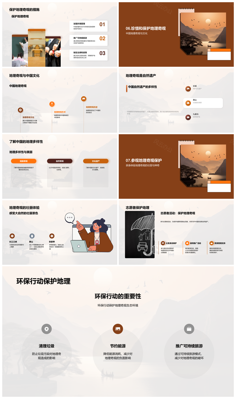 这款模板以中国风水墨意境为基调,融合森系自然美学,呈现沉稳大气的视觉效果。采用浅绿、墨绿、沙色构筑清新基调,点缀正红、酒红增强视觉层次,原创手绘纹样与留白设计传递东方韵味。矢量无损格式适配各类演示场景,高清画质确保放大细节依旧精致。专业图表模块支持数据可视化,逻辑架构严谨。轻量文件兼顾文艺质感与流畅操作,适用于学术汇报、商务提案等场景,以克制设计传递深厚文化底蕴,助力内容表达更具专业深度。