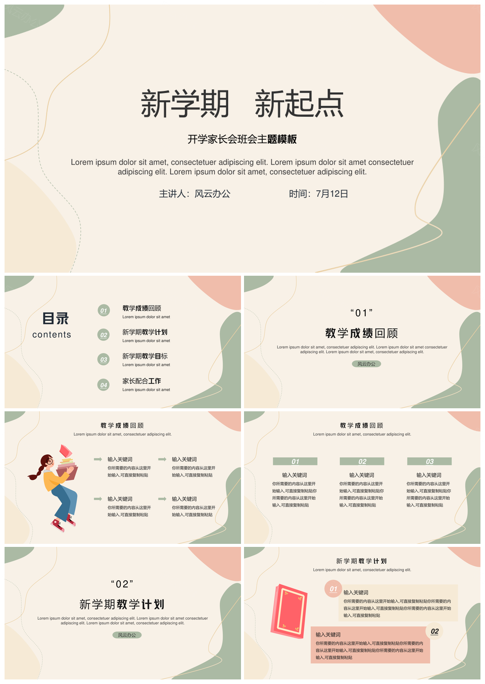 风云办公提供的静态绿色开学主题班会家长会PPT模板,下载格式为pptx,一共15页,作品中文字及图均可以修改和编辑,图片更改请在作品中右键图片并更换,文字修改请直接点击文字进行修改。