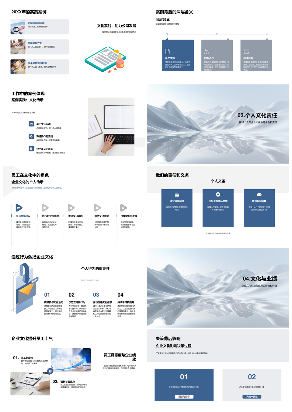 这是一张企业文化核心实践案例责任驱动业绩士气PPT模板,包含企业文化、核心、实践、案例、责任、驱动、业绩、士气等主题内容,也可用作责任驱动业绩士气、企业文化核心实践案例、核心实践案例责任驱动、责任驱动案例业绩士气、企业文化核心实践案例、企业文化核心责任驱动、核心责任驱动业绩士气、实践案例责任驱动业绩、企业文化核心责任驱动、责任驱动业绩士气案例、责任驱动案例业绩、核心实践责任驱动、企业文化核心案例、责任驱动业绩、核心实践案例、企业文化核心等PPT场景使用。 风云办公提供的企业文化核心实践案例责任驱动业绩士气PPT模板,下载格式为pptx,一共23页,作品中文字及图均可以修改和编辑,图片更改请在作品中右键图片并更换,文字修改请直接点击文字进行修改。