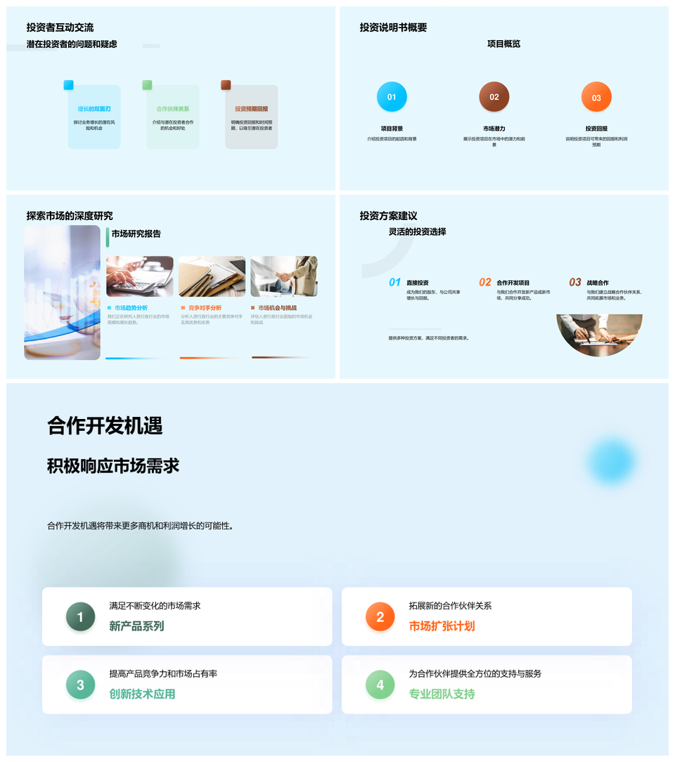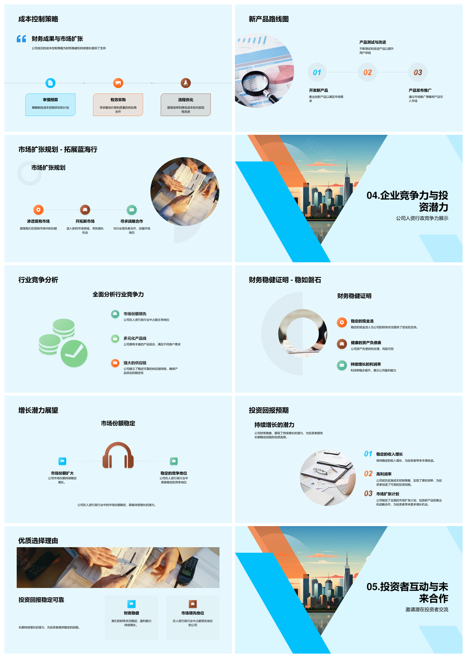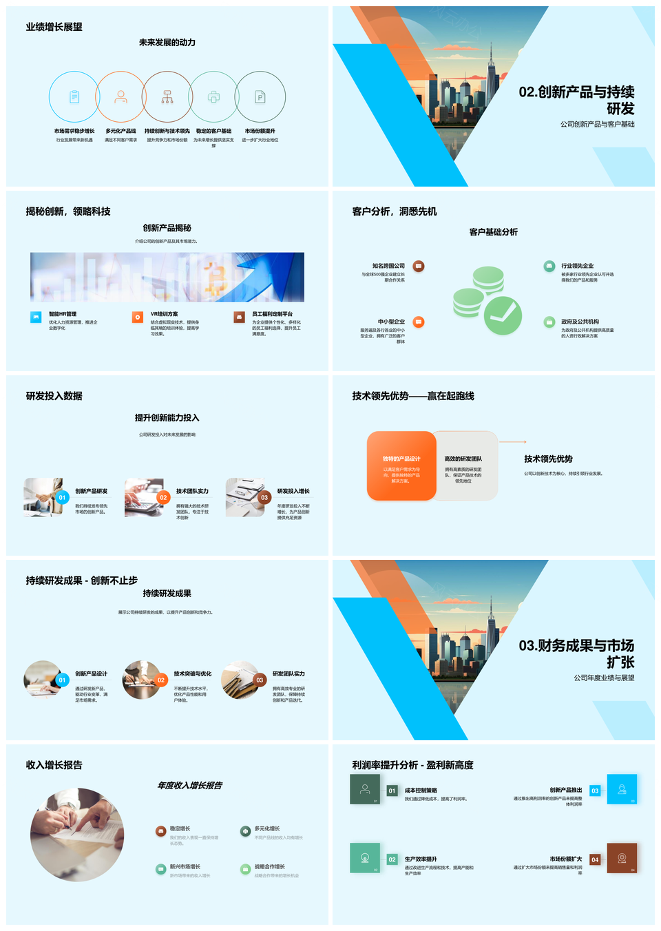 这是一张企业业务拓展投资潜力稳健财务创新产品市场前瞻PPT模板,包含企业、业务拓展、投资、潜力、稳健、财务、创新产品、市场前瞻等主题内容,也可用作业务拓展投资潜力、稳健财务创新产品、创新产品市场前瞻、企业业务拓展、投资潜力稳健、稳健财务创新、创新产品市场、产品市场前瞻、企业业务、业务拓展、拓展投资、投资潜力、稳健财务、财务创新、创新产品等PPT场景使用。 风云办公提供的企业业务拓展投资潜力稳健财务创新产品市场前瞻PPT模板,下载格式为pptx,一共33页,作品中文字及图均可以修改和编辑,图片更改请在作品中右键图片并更换,文字修改请直接点击文字进行修改。