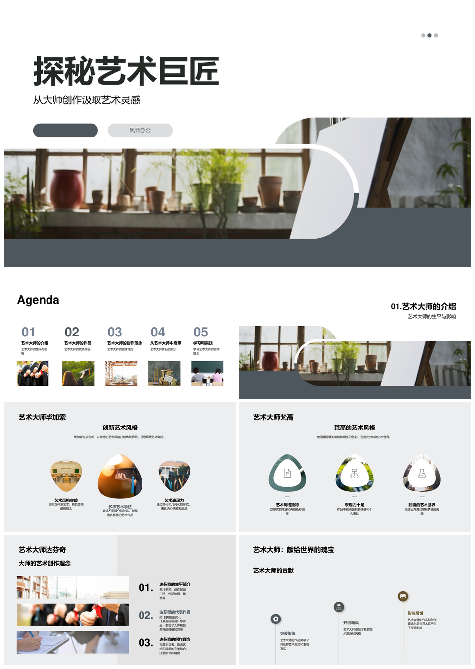 风云办公提供的初中艺术课堂探秘大师创作与调色板PPT模板,下载格式为pptx,一共33页,作品中文字及图均可以修改和编辑,图片更改请在作品中右键图片并更换,文字修改请直接点击文字进行修改。