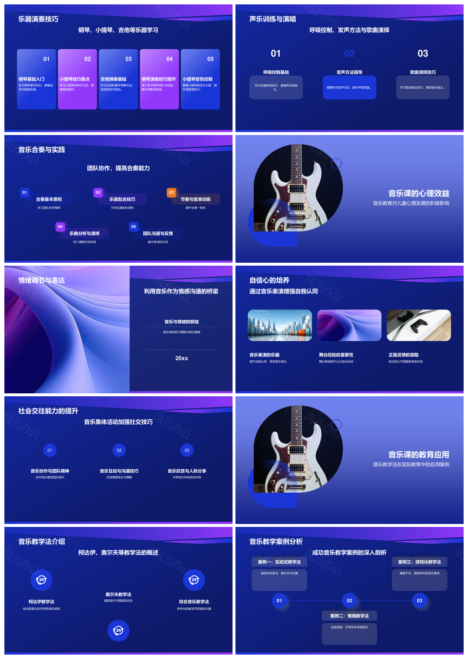 风云办公提供的电吉他弦乐布鲁斯摇滚爵士古典音乐课PPT模板,下载格式为pptx,一共20页,作品中文字及图均可以修改和编辑,图片更改请在作品中右键图片并更换,文字修改请直接点击文字进行修改。