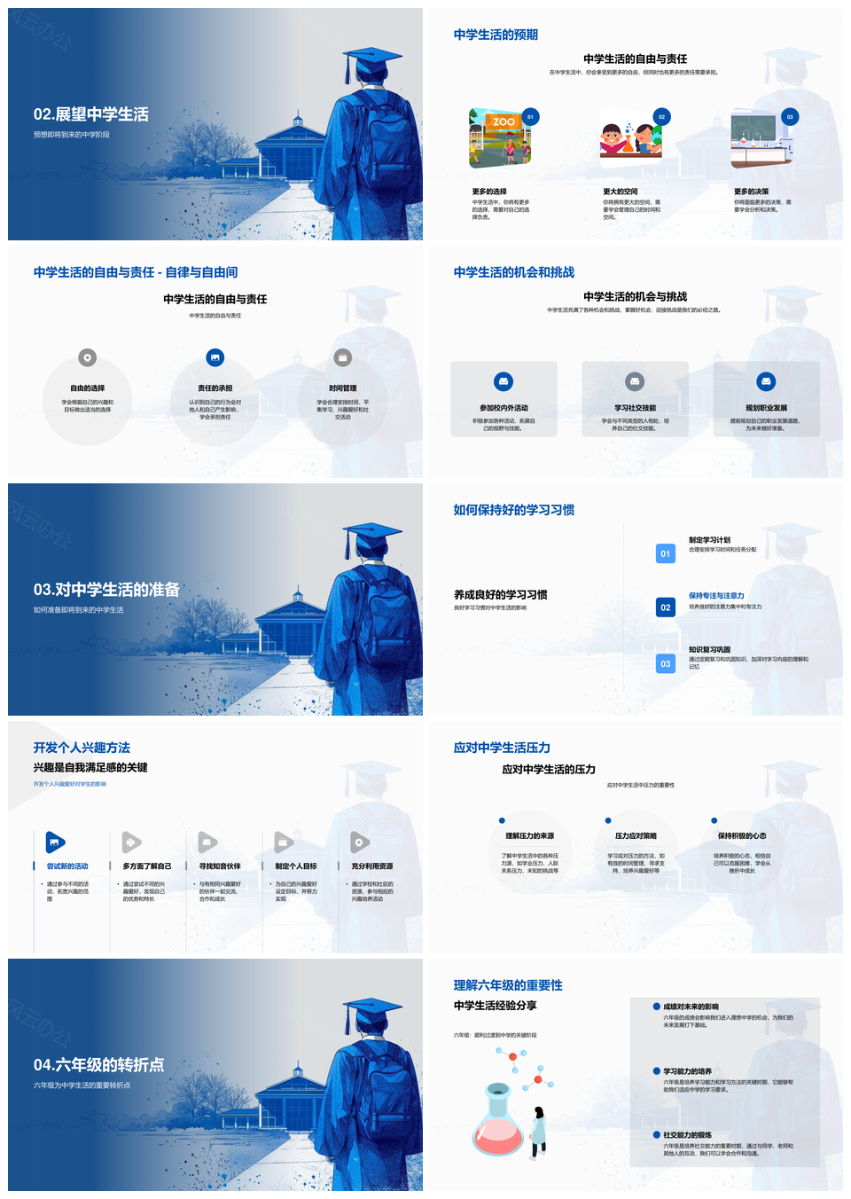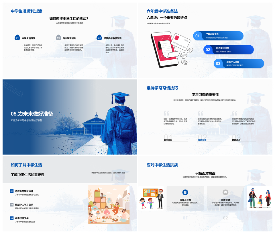 六年级学生中学适应学习习惯兴趣压力应对PPT模板推荐
