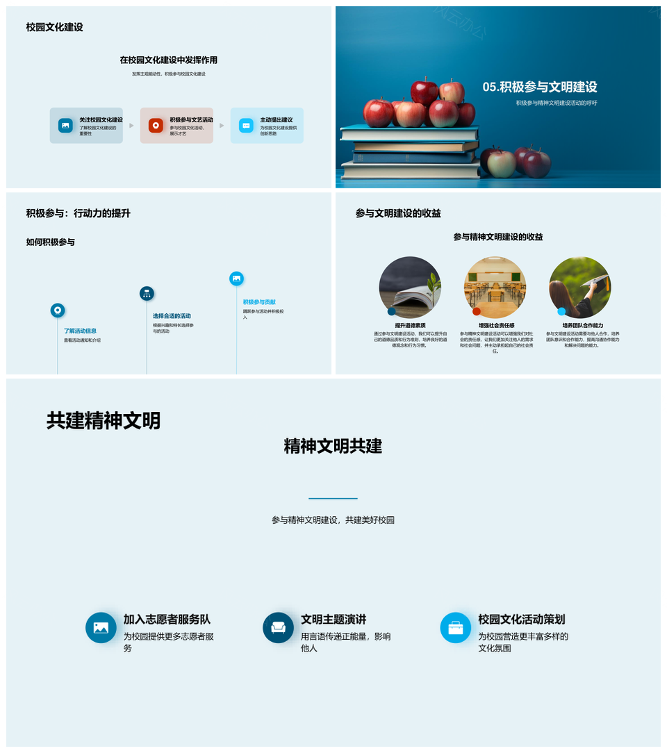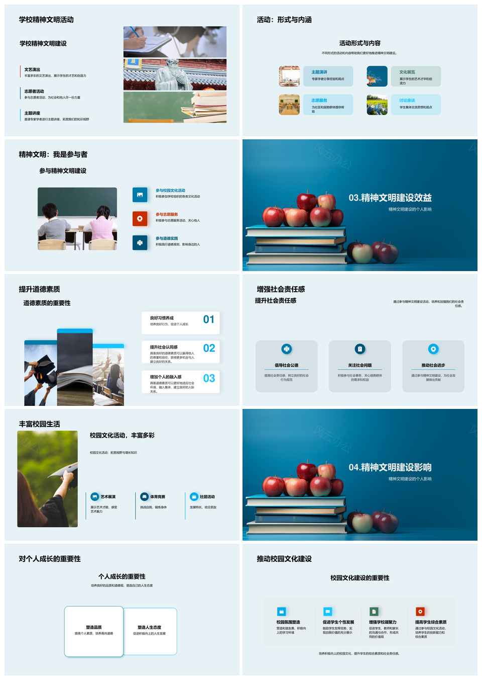风云办公提供的共筑文明校园强化责任道德教育PPT模板,下载格式为pptx,一共23页,作品中文字及图均可以修改和编辑,图片更改请在作品中右键图片并更换,文字修改请直接点击文字进行修改。