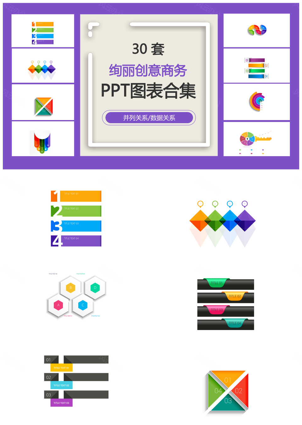风云办公提供的绚丽创意商务并列关系数据关系PPT图表合集,下载格式为pptx,一共31页,作品中文字及图均可以修改和编辑,图片更改请在作品中右键图片并更换,文字修改请直接点击文字进行修改。