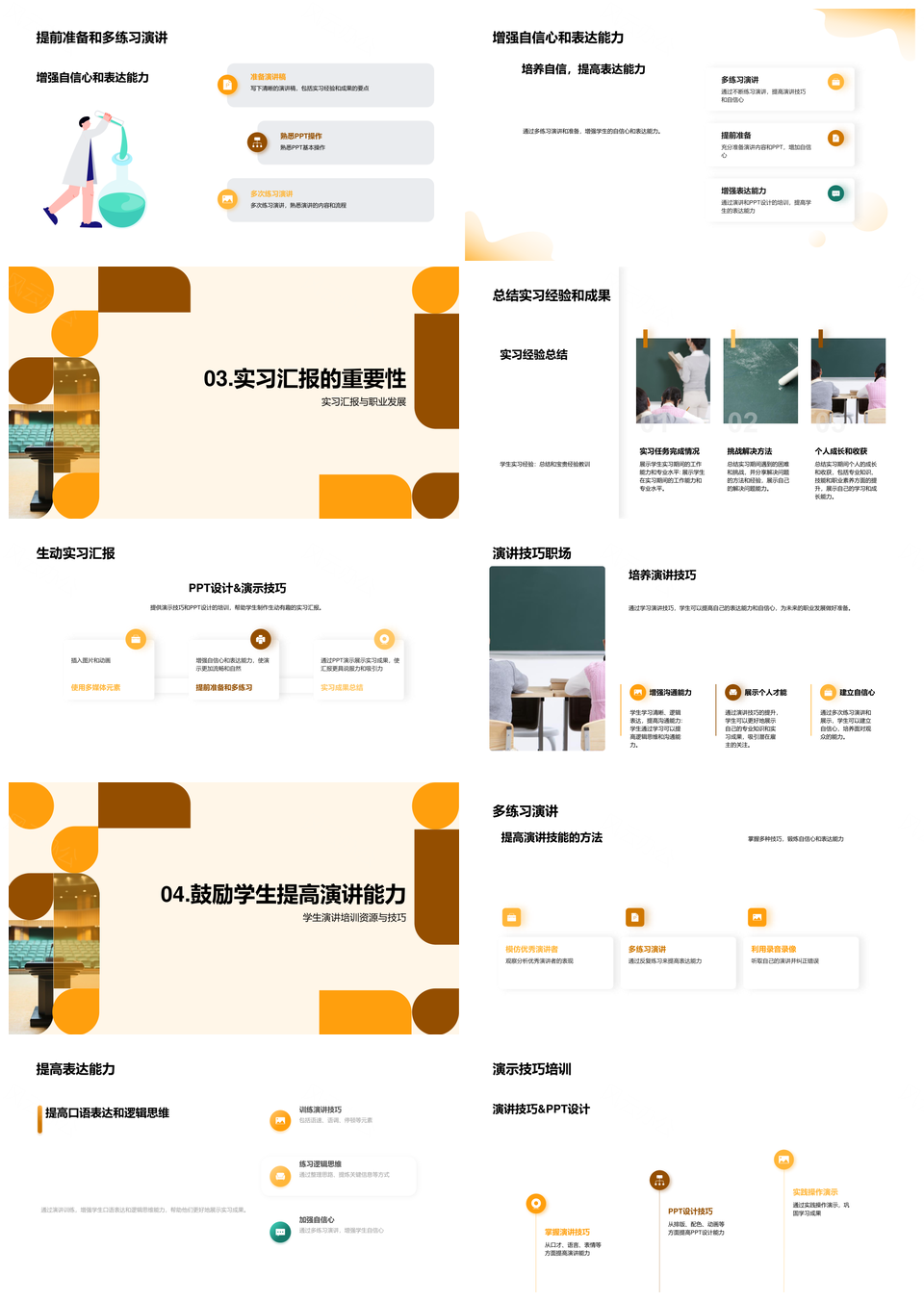 风云办公提供的学生实习汇报PPT设计演示技巧职业发展,下载格式为pptx,一共21页,作品中文字及图均可以修改和编辑,图片更改请在作品中右键图片并更换,文字修改请直接点击文字进行修改。