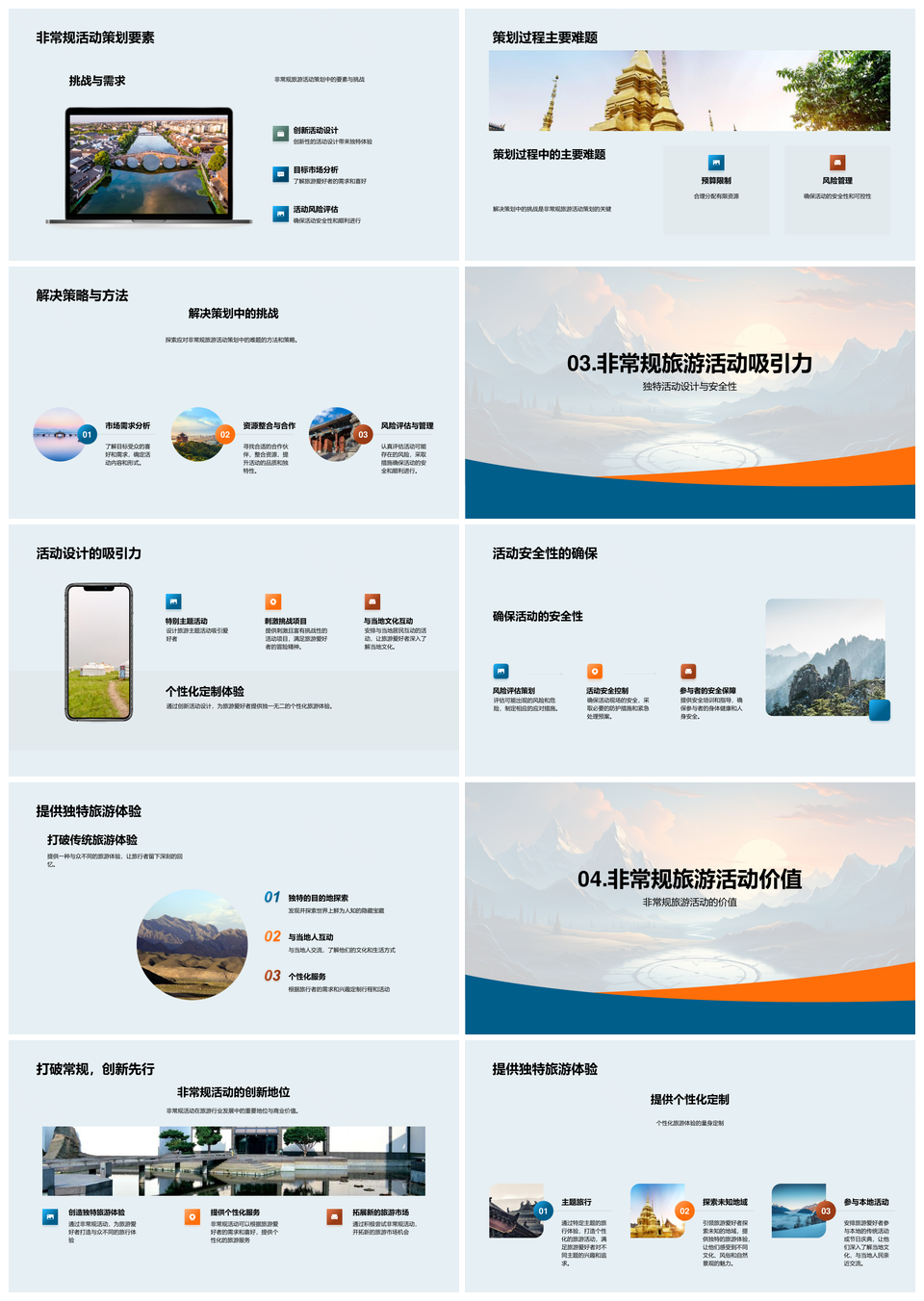 这是一张非常规旅游活动策划山脉安全体验设计PPT模板,包含非常规、旅游、活动、策划、山脉、安全、体验、设计等主题内容,也可用作非常规旅游活动策划、非常规旅游策划山脉安全、山脉安全体验设计、旅游活动策划、安全体验设计、非常规旅游策划、非常规活动策划、旅游活动山脉安全、活动策划山脉安全、策划山脉安全体验、山脉安全体验、安全体验活动策划、体验设计策划、山脉策划设计、安全体验山脉等PPT场景使用。