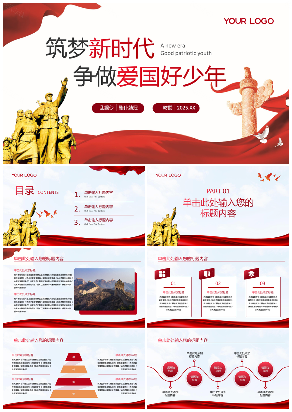 这是一张2025红色党政建设引领爱国少年筑梦新时代PPT模板,包含2025、红色、党政建设、引领、爱国少年、筑梦、新时代等主题内容,也可用作2025红色党政建设引领、红色党政建设引领爱国、党政建设引领爱国少年、引领爱国少年筑梦、爱国少年筑梦新时代、2025红色党政建设、红色党政建设引领、党政建设引领爱国、引领爱国少年、爱国少年筑梦、少年筑梦新时代、红色党政建设、党政建设引领、爱国少年、筑梦新时代等PPT场景使用。 风云办公提供的2025红色党政建设引领爱国少年筑梦新时代PPT模板,下载格式为pptx,一共10页,作品中文字及图均可以修改和编辑,图片更改请在作品中右键图片并更换,文字修改请直接点击文字进行修改。