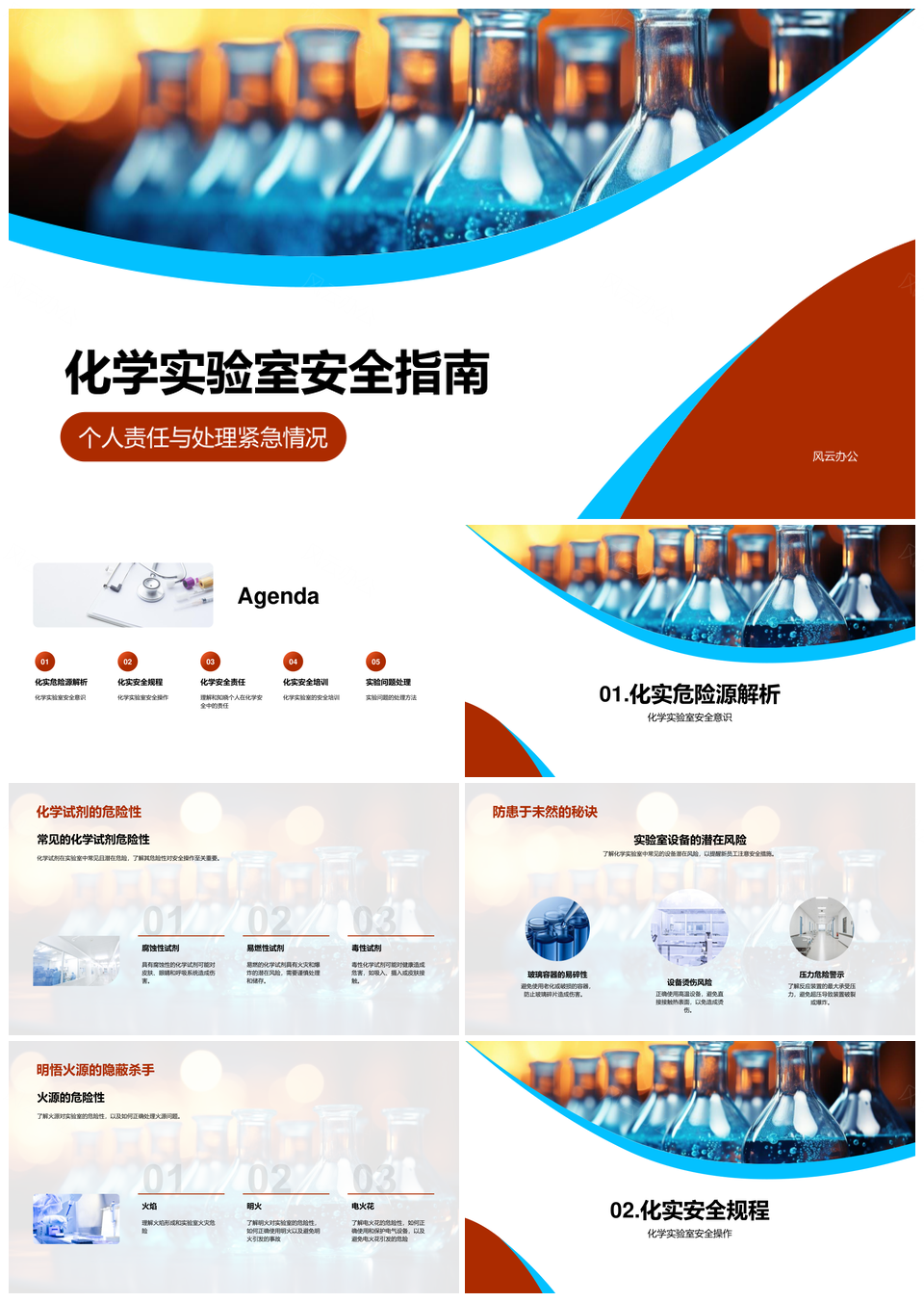 风云办公提供的化学实验室安全防护与应急处理指南PPT模板,下载格式为pptx,一共23页,作品中文字及图均可以修改和编辑,图片更改请在作品中右键图片并更换,文字修改请直接点击文字进行修改。