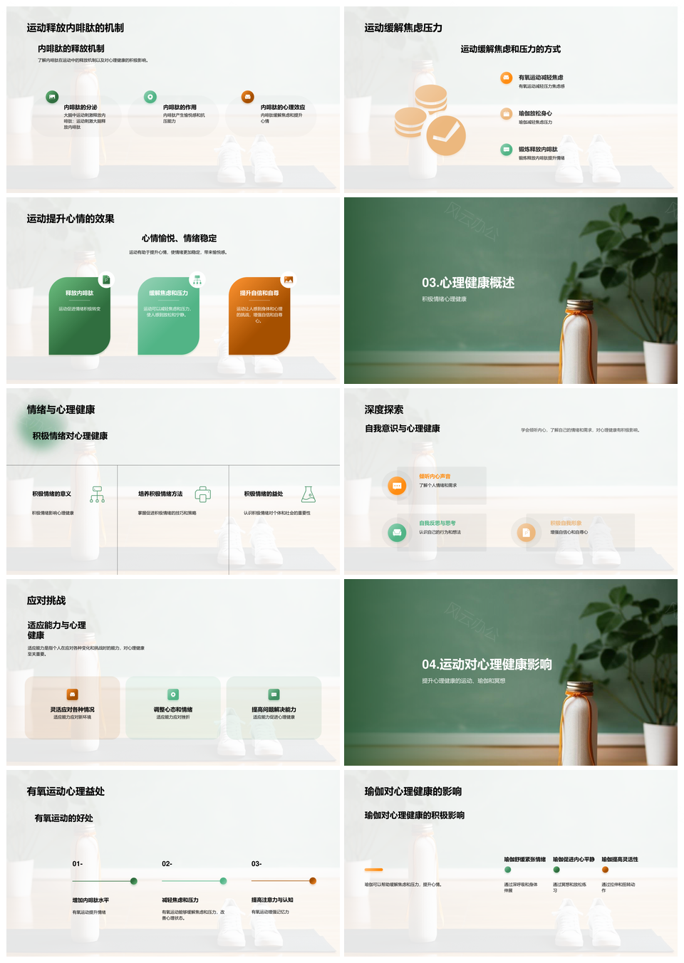 这是一张运动释放内啡肽缓解焦虑压力提升心理健康PPT模板,包含运动、释放、内啡肽、缓解、焦虑、压力、提升、心理健康等主题内容,也可用作运动释放内啡肽缓解、释放内啡肽缓解焦虑、内啡肽缓解焦虑压力、缓解焦虑压力提升、运动释放内啡肽、释放内啡肽缓解、内啡肽缓解焦虑、缓解焦虑压力、焦虑压力提升、压力提升心理健康、运动缓解焦虑、释放缓解压力、提升心理健康、释放压力、缓解压力等PPT场景使用。 风云办公提供的运动释放内啡肽缓解焦虑压力提升心理健康PPT模板,下载格式为pptx,一共26页,作品中文字及图均可以修改和编辑,图片更改请在作品中右键图片并更换,文字修改请直接点击文字进行修改。
