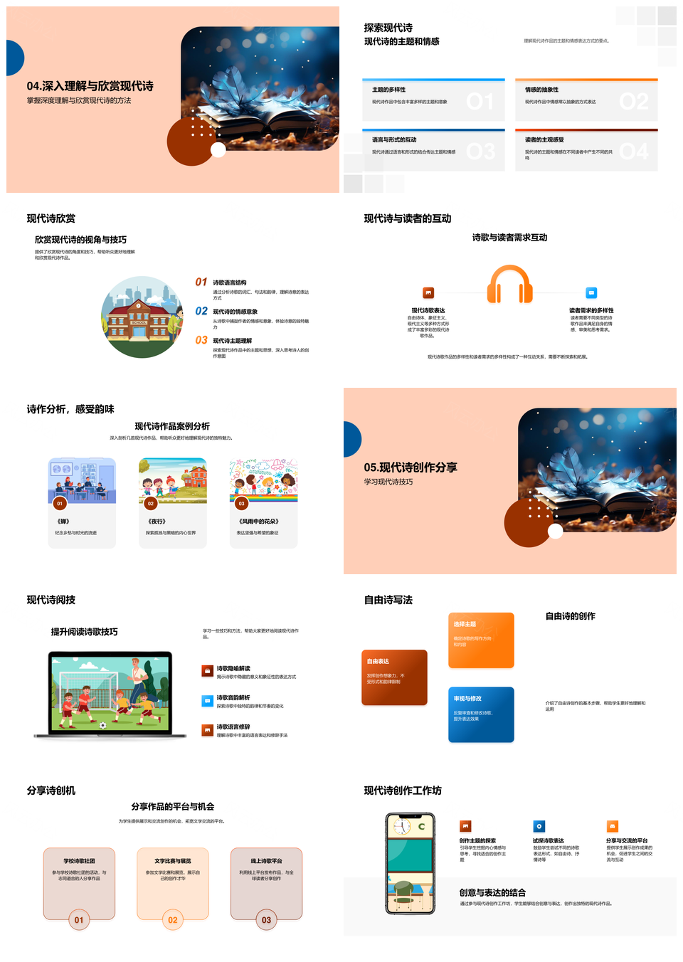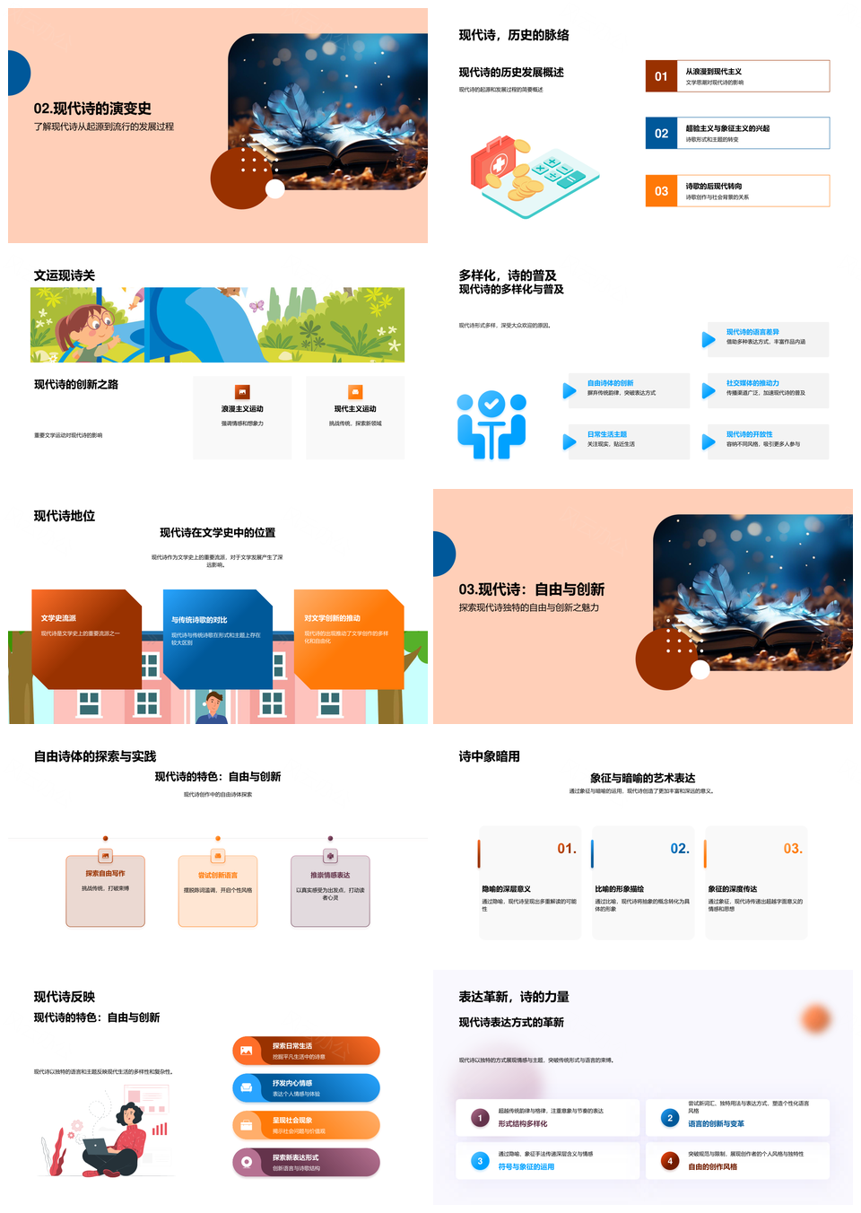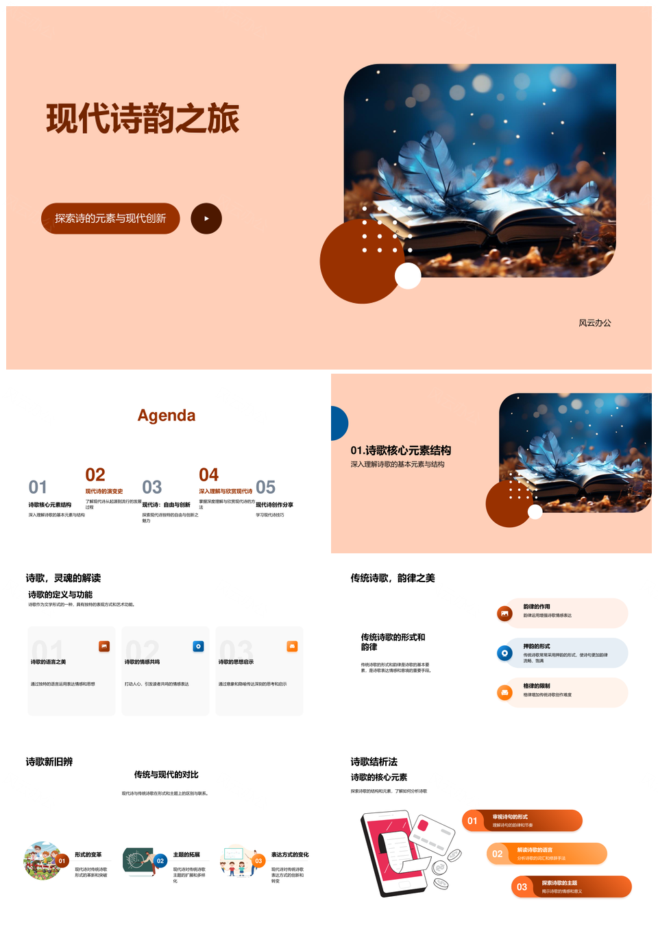 风云办公提供的现代诗自由体诗史韵律析新启书PPT模板,下载格式为pptx,一共28页,作品中文字及图均可以修改和编辑,图片更改请在作品中右键图片并更换,文字修改请直接点击文字进行修改。