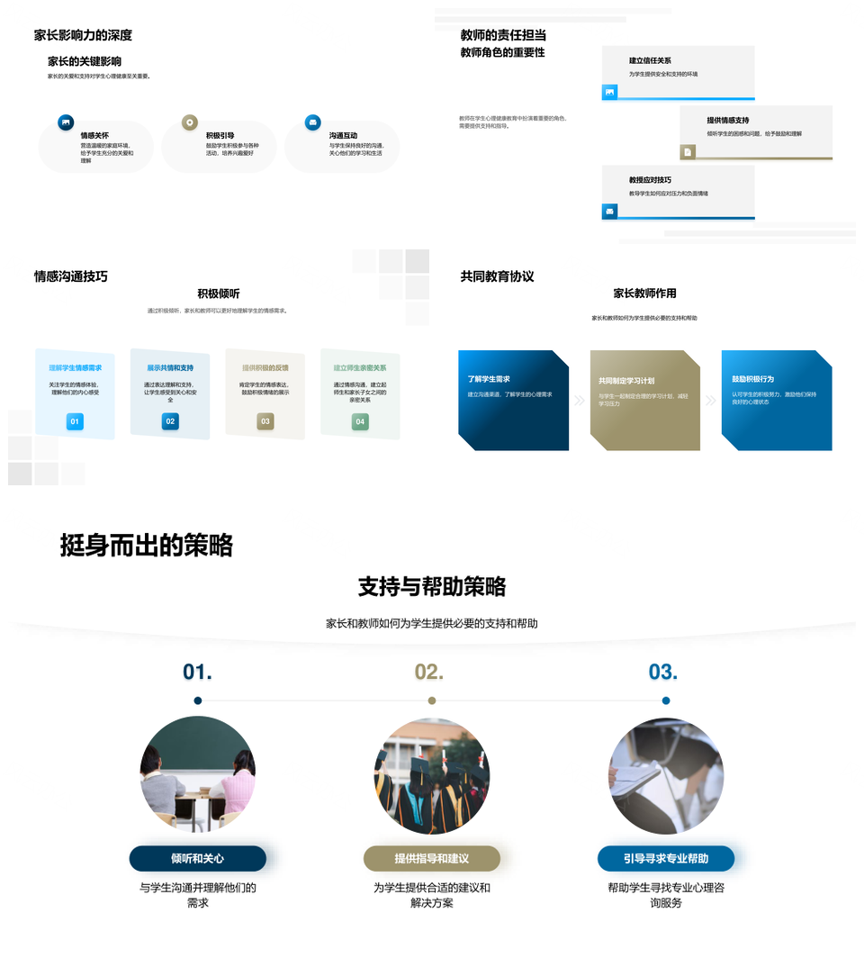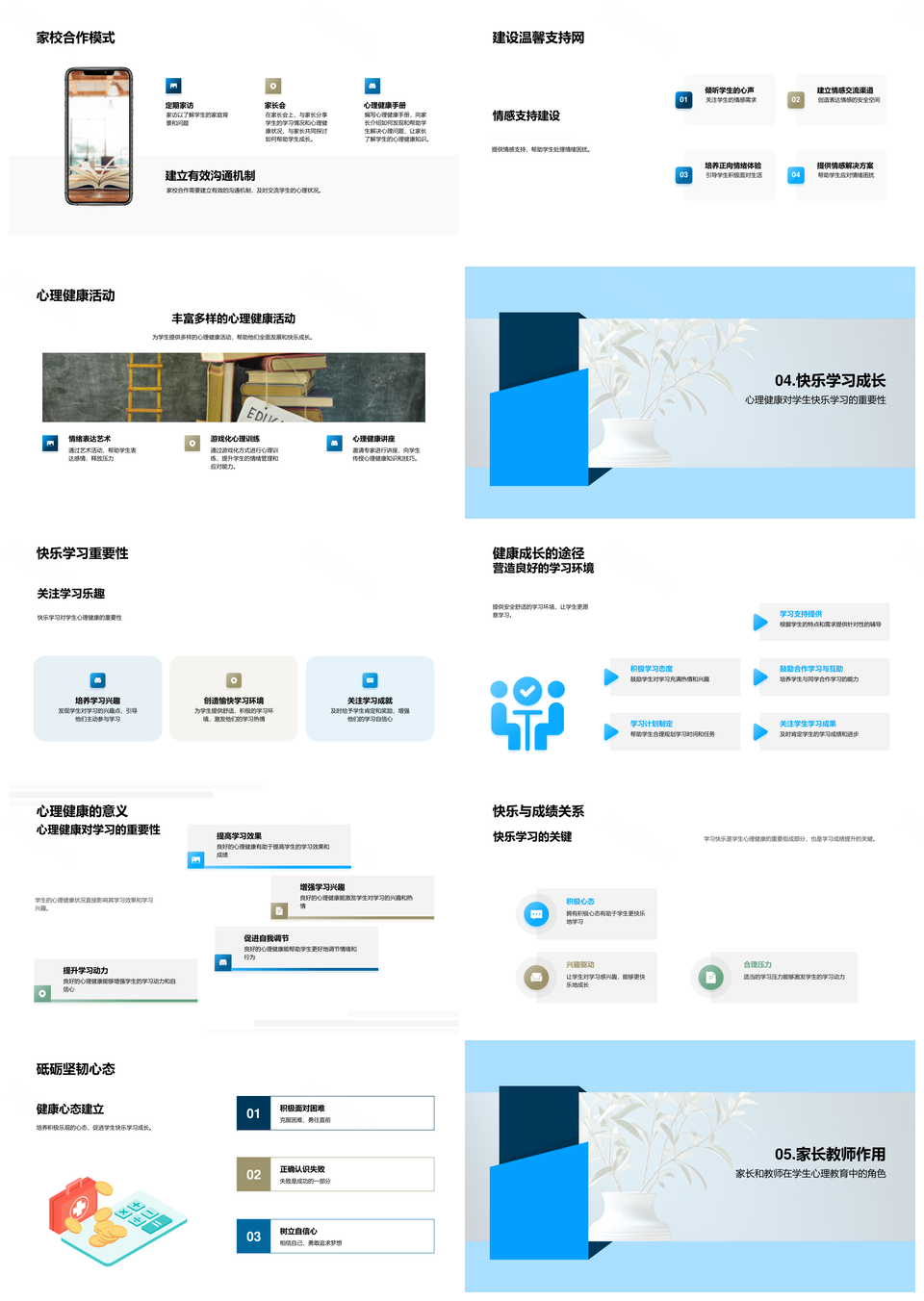 这是一张家校教育策略助力学生心理健康快乐成长PPT模板,包含家校教育、策略、助力、学生、心理、健康、快乐、成长等主题内容,也可用作家校教育策略助力、教育策略助力学生、策略助力学生心理健康、助力学生心理健康快乐、学生心理健康快乐成长、家校教育策略、教育策略助力、策略助力学生、助力学生心理健康、学生心理健康快乐、心理健康快乐成长、家校教育、教育策略、策略助力、助力学生等PPT场景使用。 风云办公提供的家校教育策略助力学生心理健康快乐成长PPT模板,下载格式为pptx,一共33页,作品中文字及图均可以修改和编辑,图片更改请在作品中右键图片并更换,文字修改请直接点击文字进行修改。