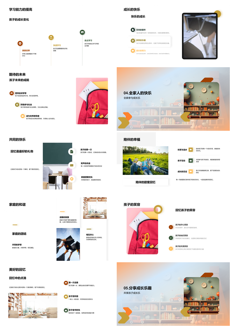 这是一张孩子成长相册历程趣事变化生日玩具全家乐PPT模板,包含孩子、成长相册、历程、趣事、变化、生日、玩具、全家乐等主题内容,也可用作孩子成长相册趣事、孩子成长生日全家乐、成长相册历程趣事、相册历程趣事变化、历程趣事变化生日、趣事变化生日玩具、变化生日玩具全家乐、孩子成长相册、成长相册历程、相册历程趣事、历程趣事变化、趣事变化生日、变化生日玩具、生日玩具全家乐、孩子成长等PPT场景使用。 风云办公提供的孩子成长相册历程趣事变化生日玩具全家乐PPT模板,下载格式为pptx,一共33页,作品中文字及图均可以修改和编辑,图片更改请在作品中右键图片并更换,文字修改请直接点击文字进行修改。