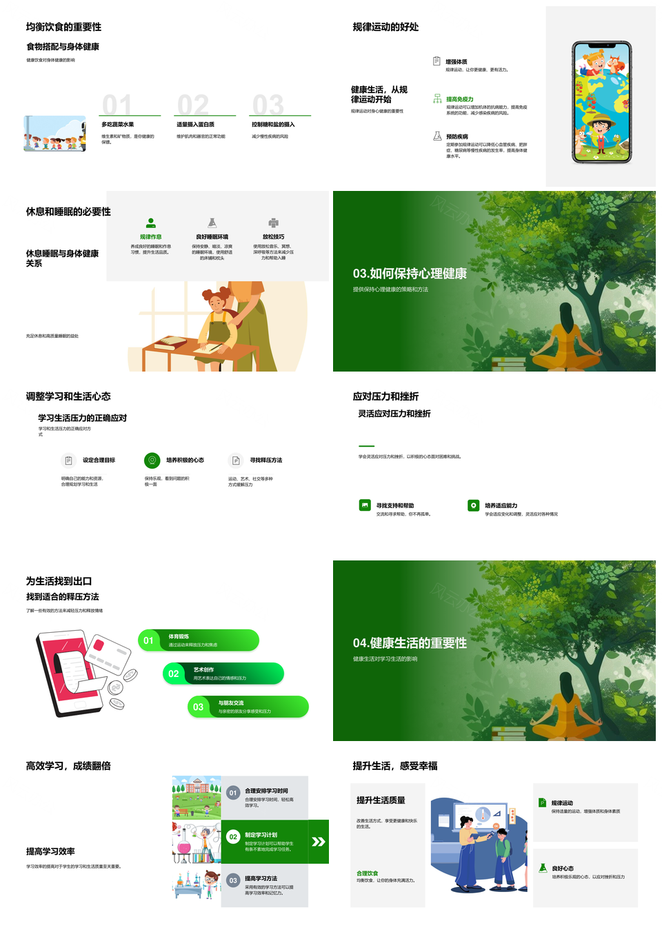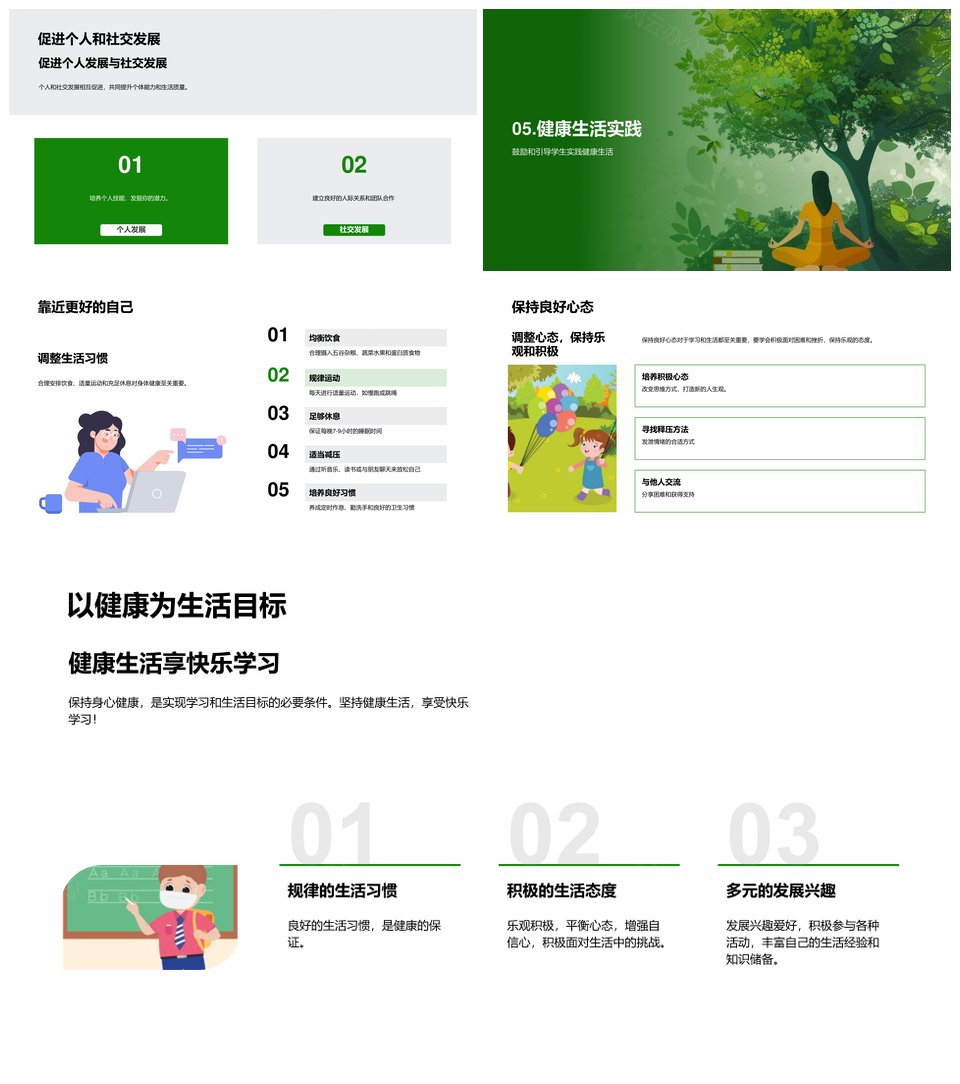 这是一张健康生活优境教育均衡饮食运动睡眠好心态PPT模板,包含健康生活、优境教育、均衡饮食、运动、睡眠、好心态等主题内容,也可用作健康生活优境教育均衡饮食、优境教育均衡饮食运动、教育均衡饮食运动睡眠、健康生活运动睡眠好心态、健康生活均衡饮食运动、均衡饮食运动睡眠好心态、运动睡眠好心态、优境教育运动睡眠、健康生活优境教育、健康生活好心态、均衡饮食运动、教育均衡饮食、运动睡眠好心态、健康运动睡眠、均衡饮食好心态等PPT场景使用。 风云办公提供的健康生活优境教育均衡饮食运动睡眠好心态PPT模板,下载格式为pptx,一共23页,作品中文字及图均可以修改和编辑,图片更改请在作品中右键图片并更换,文字修改请直接点击文字进行修改。