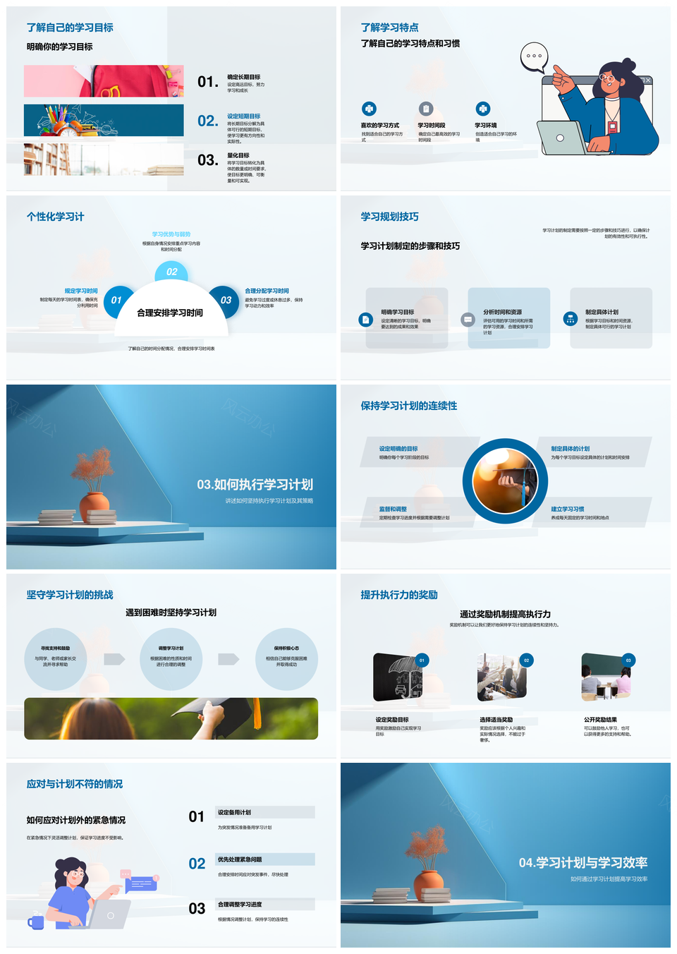 这是一张高效学习计划制定执行提升效率目标习惯奖励时钟PPT模板,包含高效、学习计划、制定、执行、提升、效率、目标、习惯、奖励、时钟等主题内容,也可用作高效学习计划制定、学习计划制定执行、制定执行提升效率、执行提升效率目标、提升效率目标习惯、效率目标习惯奖励、目标习惯奖励时钟、高效学习计划、计划制定执行、制定执行提升、提升效率目标、效率目标习惯、目标习惯奖励、高效学习、学习计划、提升效率等PPT场景使用。 风云办公提供的高效学习计划制定执行提升效率目标习惯奖励时钟PPT模板,下载格式为pptx,一共25页,作品中文字及图均可以修改和编辑,图片更改请在作品中右键图片并更换,文字修改请直接点击文字进行修改。