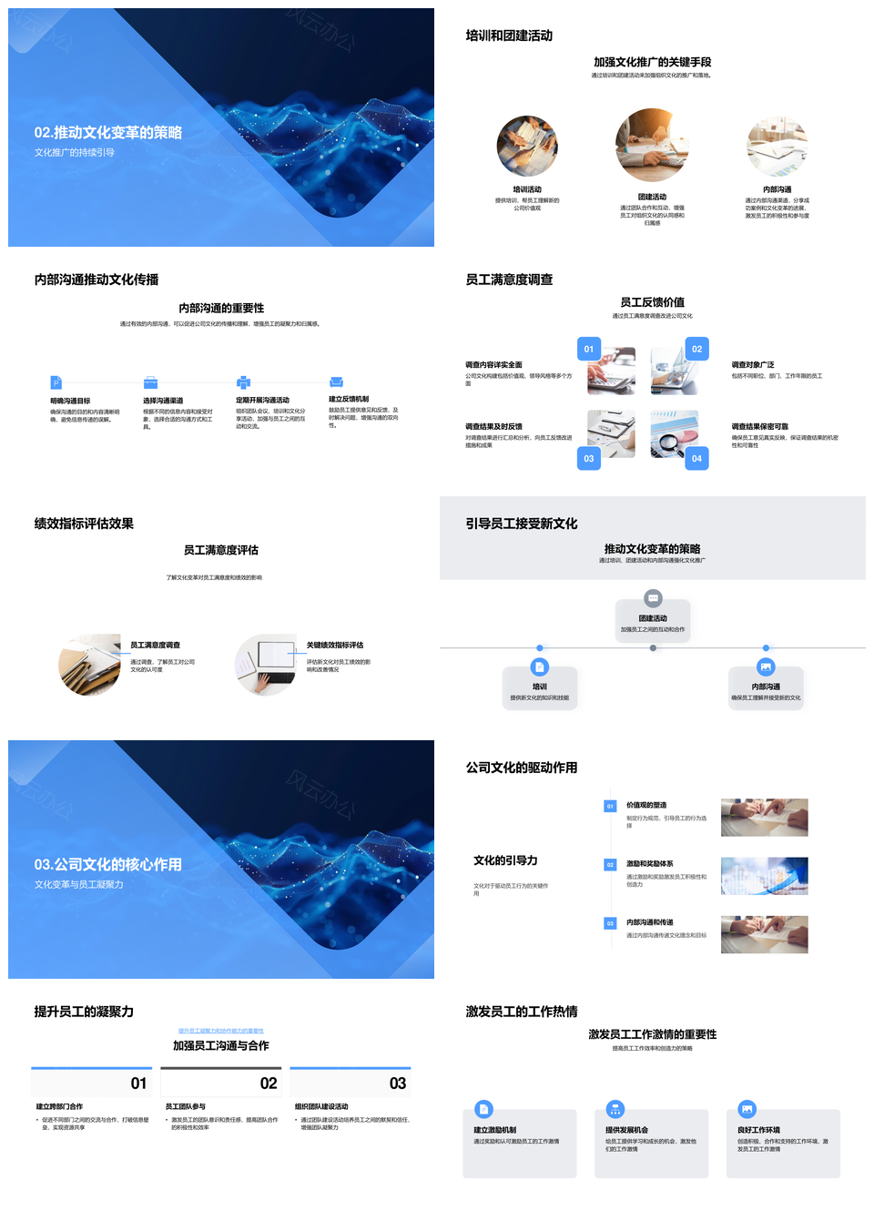 这是一张文化变革推动公司长期发展员工培训团建沟通PPT模板,包含文化变革、公司、长期发展、员工、培训、团建、沟通等主题内容,也可用作文化变革推动公司长期发展、推动公司长期发展员工培训、公司长期发展员工培训团建、长期发展员工培训团建沟通、文化变革推动公司员工培训、员工培训团建沟通推动、团建沟通推动长期发展、文化变革推动团建沟通、公司长期发展团建沟通、推动员工培训团建沟通、文化变革长期发展团建、员工培训沟通推动公司、公司团建沟通长期发展、长期发展推动员工培训、文化变革公司团建沟通等PPT场景使用。 风云办公提供的文化变革推动公司长期发展员工培训团建沟通PPT模板,下载格式为pptx,一共28页,作品中文字及图均可以修改和编辑,图片更改请在作品中右键图片并更换,文字修改请直接点击文字进行修改。