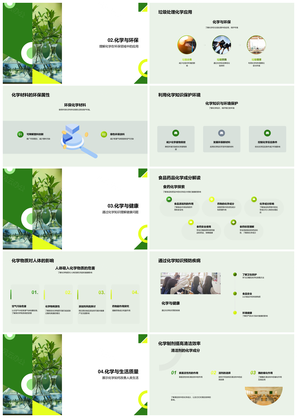 风云办公提供的化学生活中的食药清洁与环保处理PPT模板,下载格式为pptx,一共24页,作品中文字及图均可以修改和编辑,图片更改请在作品中右键图片并更换,文字修改请直接点击文字进行修改。