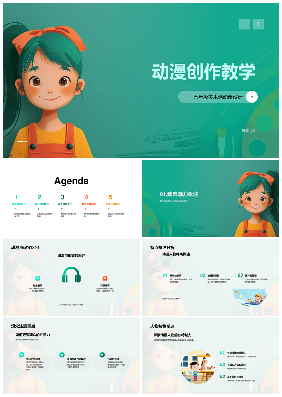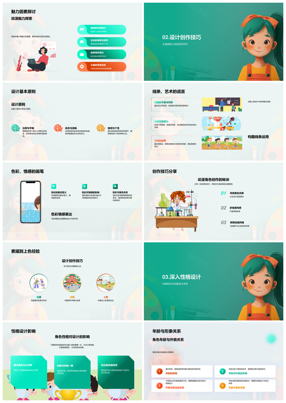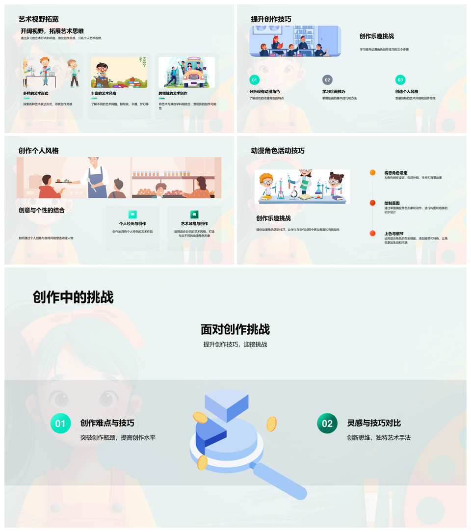 动漫创作小学人物设计美术教学构图色彩性格PPT模板推荐