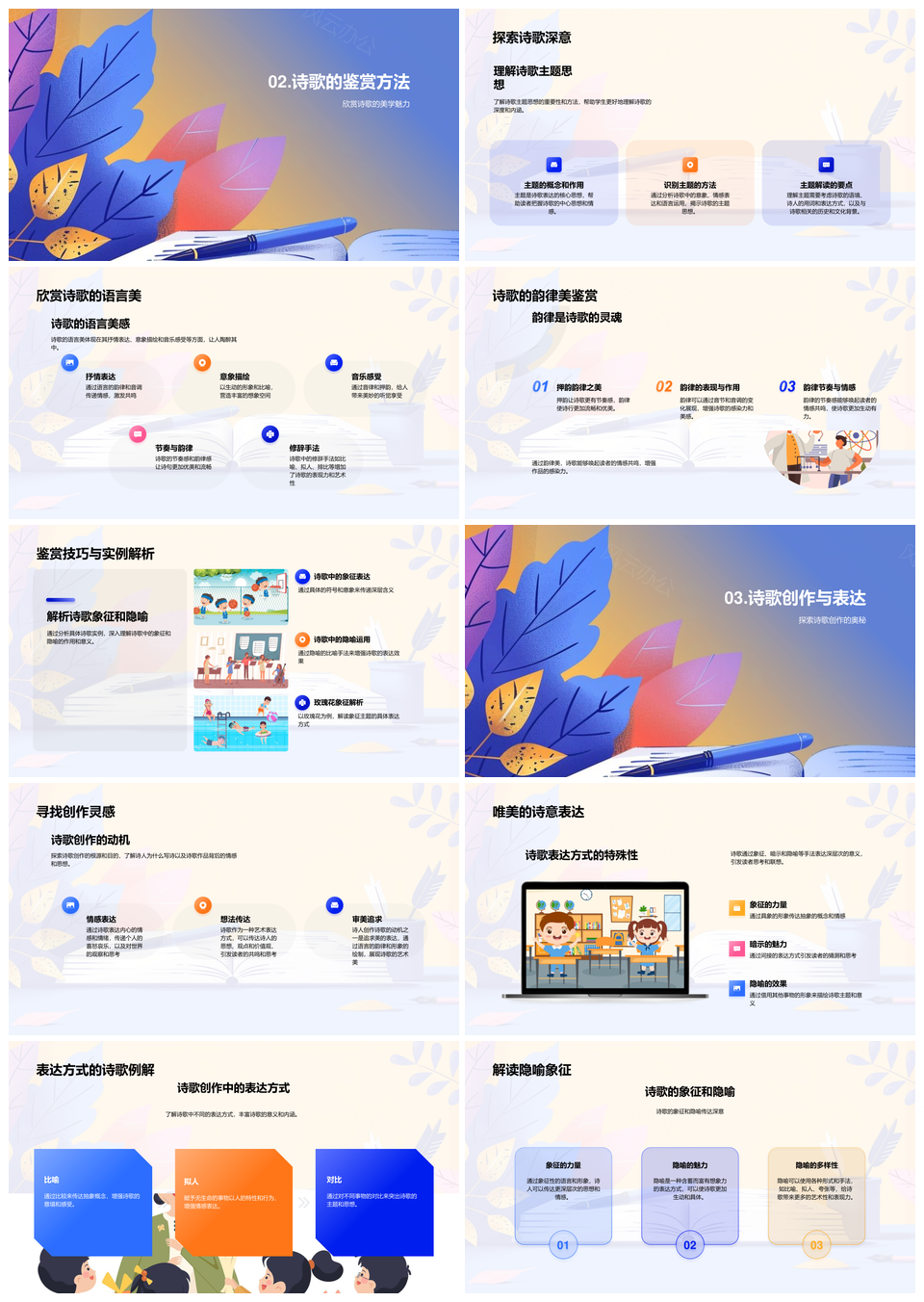 风云办公提供的诗歌解析教学美韵律特性创作动机PPT模板,下载格式为pptx,一共28页,作品中文字及图均可以修改和编辑,图片更改请在作品中右键图片并更换,文字修改请直接点击文字进行修改。